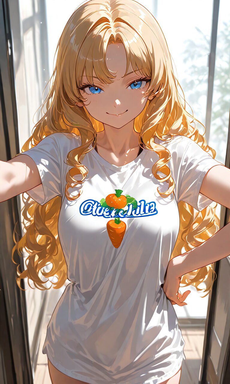 1 lady, long hair, blonde hair, blue eyes, spiral curls, smugness, (vegetable Tshirt)