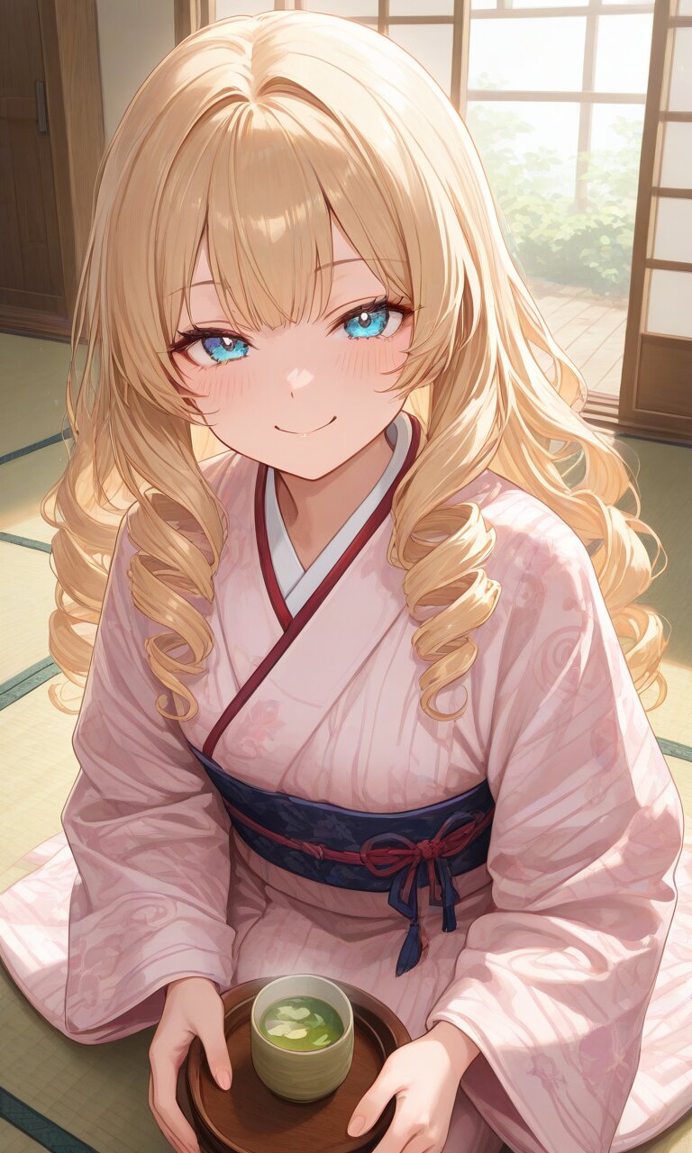 1 lady, long hair, blonde hair, blue eyes, spiral curls, smile, smugness, Japanese cloth, Japanese room, Japanese green tea