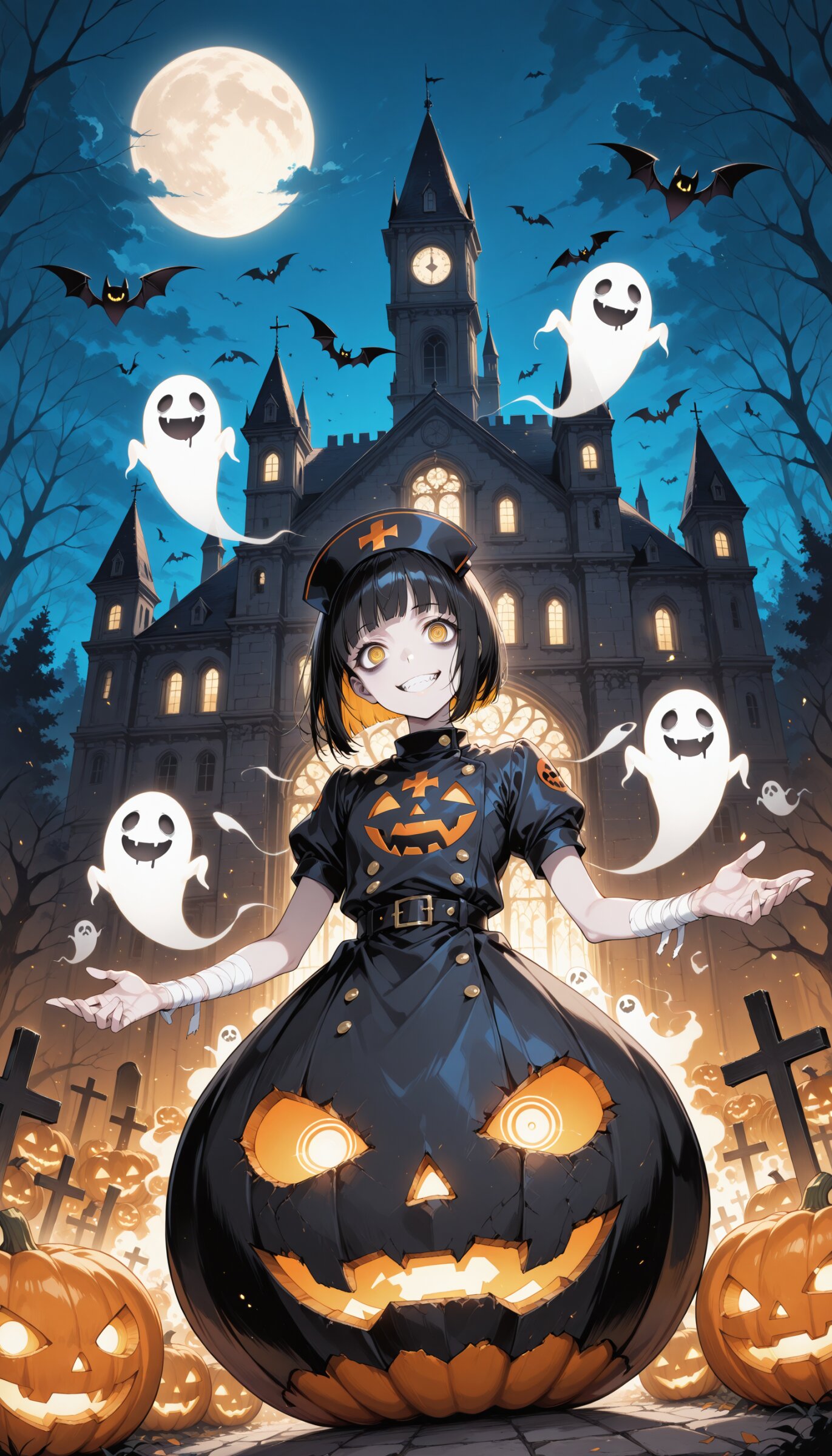 (rating: sensitive:1.2), score_9, score_8_up, score_7_up, score_6_up, source_anime, (flat color style illustration, bold colors:1.5). 1girl as hurted nurse, mysterious, tilt head, smirk, grin, black hair, square-bob cut hair, messy hair. (Crazy Eyes, @_@:1.3, bags under eyes, Crazy Smile), (lots of ghost, bats, vampire), cemetery, foggy, haunted castle, (Halloween pumpkins, black pumpkin, night parade, neon yellow eyes), from below, diagonal view, outdoor, night. (fashion illustration, horror, ultra-intricate detailed), flat design, bold colors, patterned fabric, beautiful composition, in the style of cute anime girl. BREAK insanely beautiful and detailed bandage, extremely shiny hair, beautiful small face, beautiful big round eyes, long eyelashes, double eyelids, smile, kawaii, cute, flat chest, slender, exquisitely delicate pale skin, perfect anatomy, (dynamic angle, dynamic pose), BREAK (DOF), sharp focus on the ghost, emphasizing depth, BREAK (masterpiece, aesthetic quality, 8K, ultra-detailed), perfect design, amazing quality, high quality, absurdres, highres, cinematic lighting,