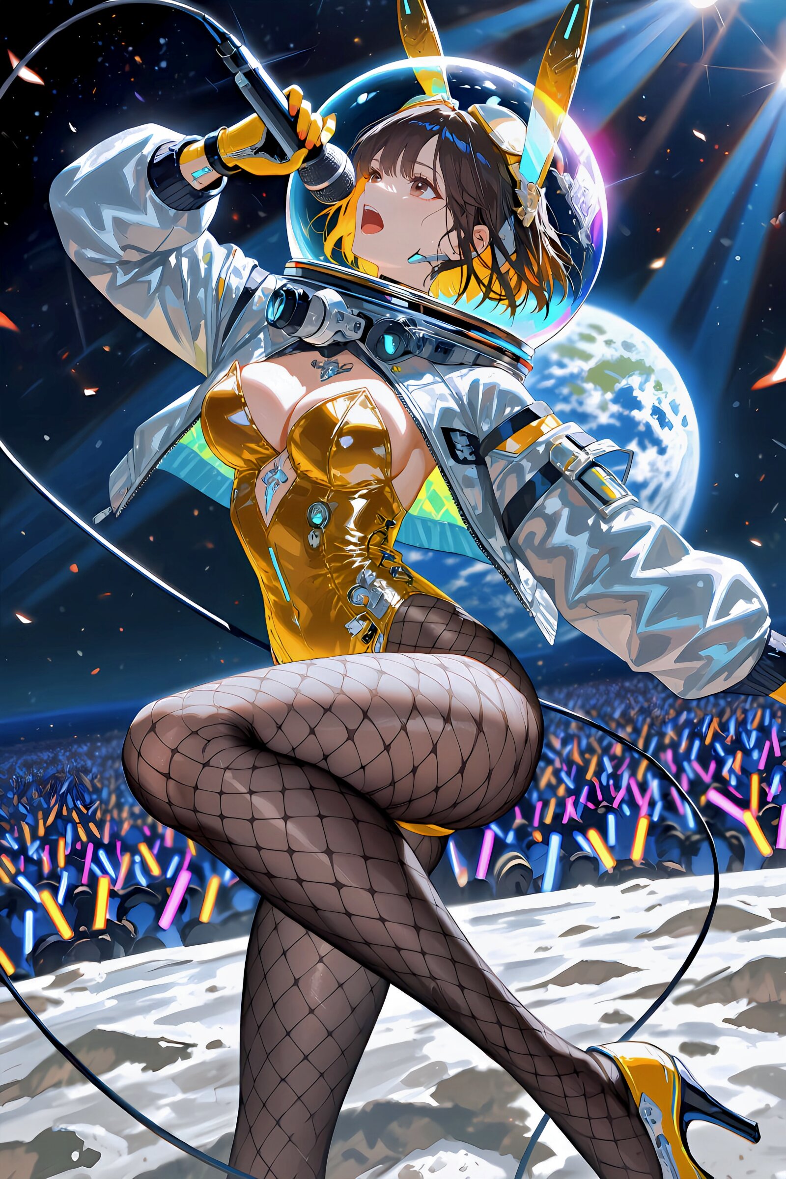 ((4k, 8k, Ultra HD)), (masterpiece:12), (best quality:12), (detailed:15), (detailed background:15),人物をクローズアップ、膝から上をクローズアップ、最高クラスのイラスト、神絵師クラスの描き込み、色鮮やかなタッチの明るい色調、カラフル、シネマティックな光、斜めに傾いた画角、解剖学的に正しい肉体、正しく整った手指、シャープで高精細な、ゲームCG風のイラスト。サイバーパンクの雰囲気。ダイナミックなアングルの迫力ある眺め。月面上でのライブコンサート。1人の成人した美少女が、空中にジャンプしながら、サイバーパンクなマイクを握って歌を歌っている。美少女は露出度の高い黄金色のバニースーツを着ている。バニースーツにはサイバーな模様が描かれており、機械が混じったサイバーパンクなデザインとなっている。バニースーツの上から、サイバーパンクな宇宙服のヘルメットと、宇宙用のサイバーパンクな銀色のジャケットを装着している。黒い網タイツをはいている。巨乳でスマートな体型。虹色のショートヘアで、前髪は長く、サイドの髪は長い。瞳の色は茶色。背景には宇宙空間が広がっており、星々が輝いている中、地球が浮かんでいる。月の大地に広がっているコンサート会場には大勢の観客が詰めて、サイリウムを振っている。少女はにっこりと笑みを浮かべている。