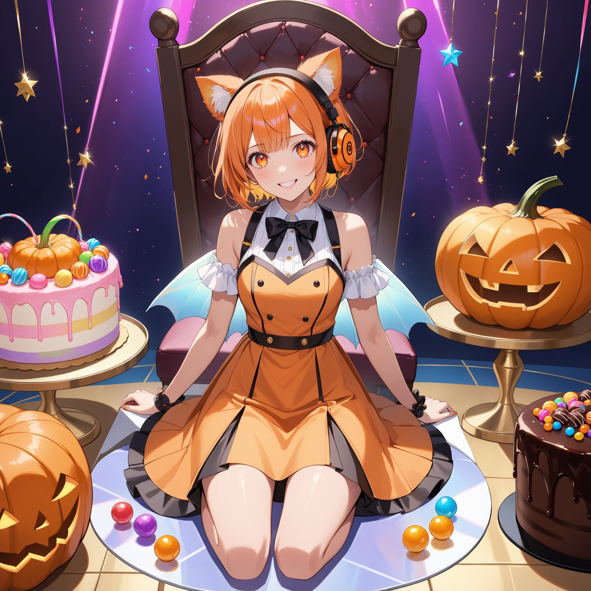 cinematic horror-pop scene:1.3, professional photographer’s perspective:1.5, Zena:1.6, pastel orange bob haircut:1.3, wearing orange headphones with small monkey ears:1.3, top idol aura:1.5, glamorous idol stage outfit with shoulder-baring design:1.3, cute short skirt with shimmering transparent accents:1.3, sitting on a throne made of colorful sweets:1.4, giant cakes oozing cream:1.3, glowing rainbow lollipops:1.4, chocolate river flowing on the floor:1.3, glowing pumpkin desserts:1.3, neon candy bats flying around:1.3, greedy demonic aura:1.5, glowing hungry eyes:1.4, mischievous but devilish smile:1.4, horror-pop lighting:1.4, cinematic ultra detail:1.5, masterpiece 8K:1.5