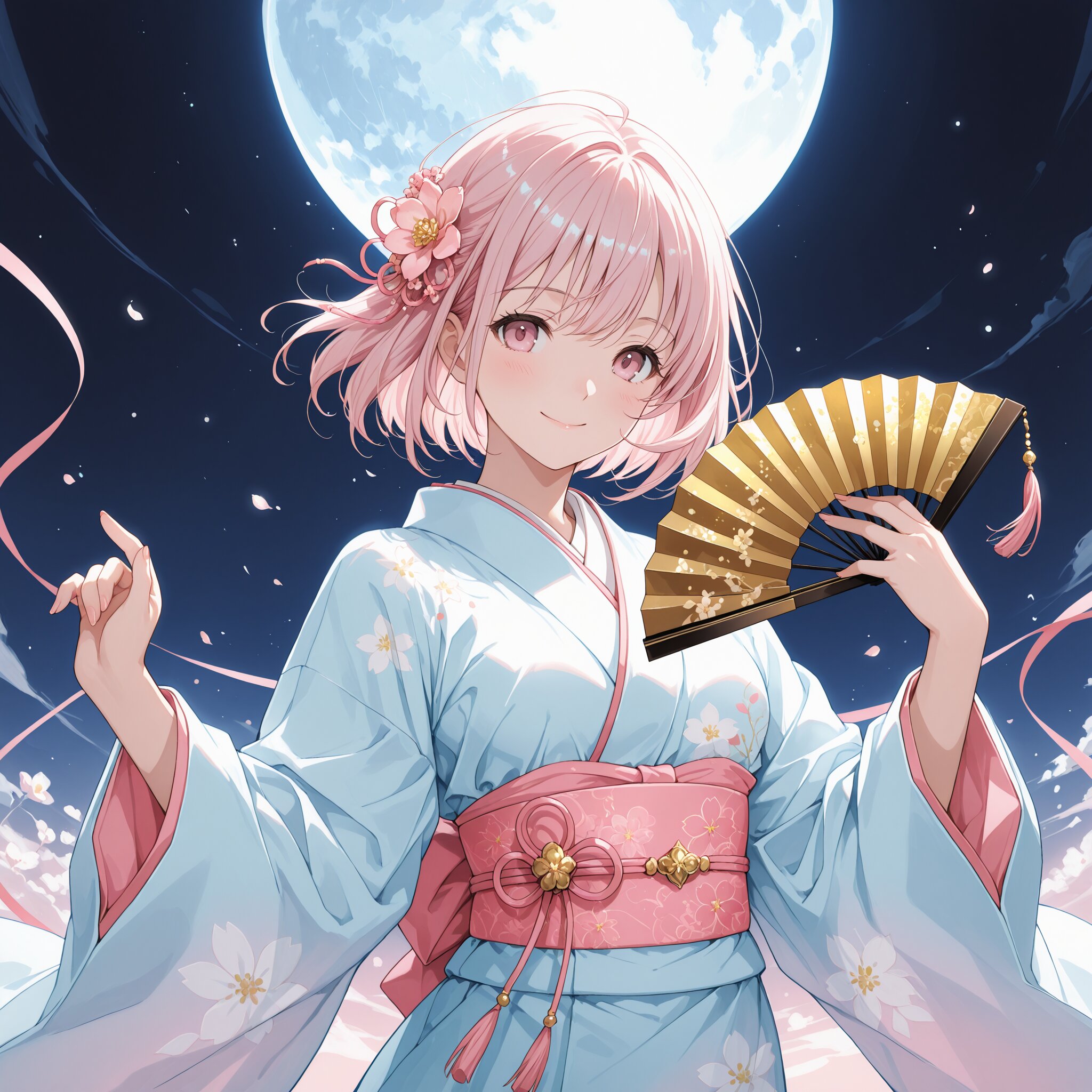 (masterpiece, best quality, ultra-detailed, highly detailed, watercolor style, soft lighting, soft pastel colors) A beautiful anime girl with light pink hair in a loose wavy short bob, light pink eyes, wearing a floral hair accessory, dressed in a kimono, shown from the upper body above the obi (waist), radiant, joyful smile, dancing energetically with both arms gracefully extended, holding an ornate golden folding fan (sensu) in one hand, her body slightly twisted to show fluid motion. Glowing moonlight trails swirl dynamically around her like flowing ribbons, with tiny shimmering particles drifting in the air. She is slightly diagonal, positioned beside a large glowing moon on the same horizontal plane, as if dancing next to it. The background is a dark night scene, emphasizing strong contrast between the soft pale blue and pink moonlight and the shadows, creating a dramatic, dreamy watercolor atmosphere full of movement and elegance.