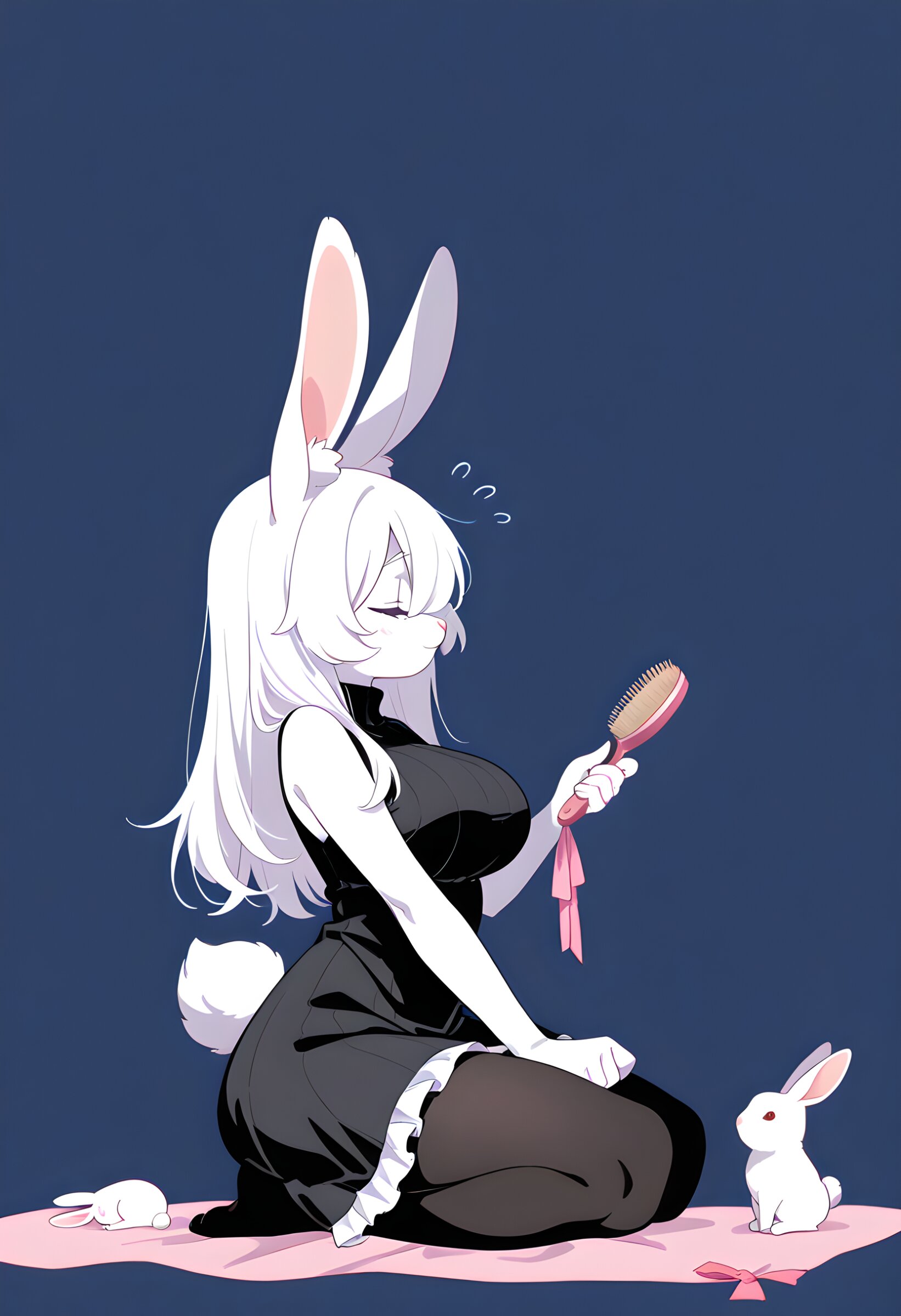 solo,short female,child,oppai loli,(rabbit girl),petite,(furry female),white fur,fluffy body fur,stand fur,white rabbit ears,rabbit nose,white rabbit tail,(large breasts),slim,thick thighs,white hair,long hair,pink ribbons,hair between eyes,hair over one eye,closed eyes,raised inner eyebrows,closed mouth,chewing,flying sweatdrops,layering,sleeveless,black dress,turtleneck dress,frilled trimmed dress,wide A-lines,black pantyhose under clothes,seiza,adjusting hair,brushing hair,grooming,holding hair brush,flying sweatdrop,looking ahead,full body,from side,profile,foreshortening,dramatic rays,saturated,smooth,dramatic angle,dark blue background,simple background,(high contrast:1.2),softy,(digital art:1.1),(2D),(stylized),(kawaii),(cute),(anime coloring),furry,(two tone fur),(furry body),perfect body,detailed face,visible wide hips,high quality,cute clothes,animal tail,animal ears,solo,voluminous thighs,masterpiece,seductive mischievous expression,eductive demeanor,((correct_anatomy)),(detailed_hands:1.5),lolitaaa, girl, small body, short girl, petite, very short, tiny, cute,black pantyhose,flat color, no lineart,Bright colors, Contour line, pale painting,gddw, <lora:flat1:0.7> <lora:hairdetailer:0.7>