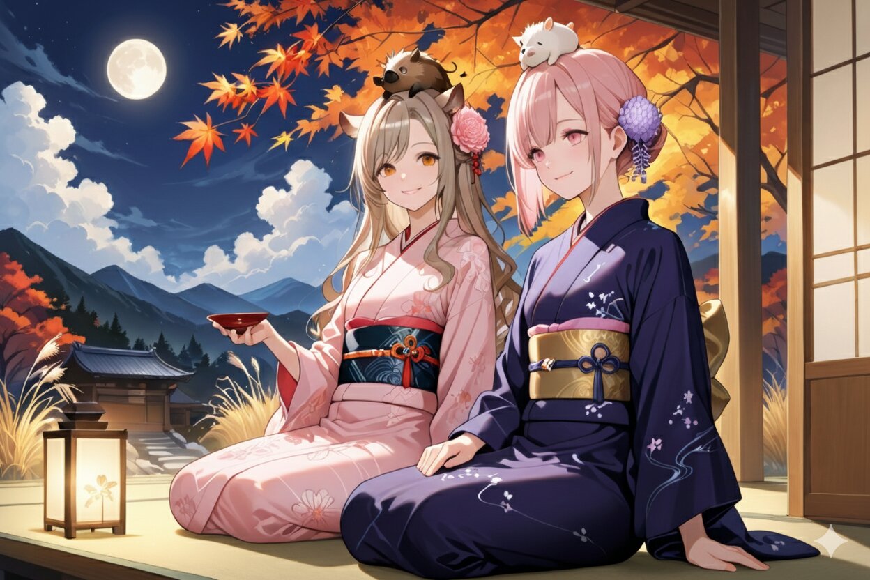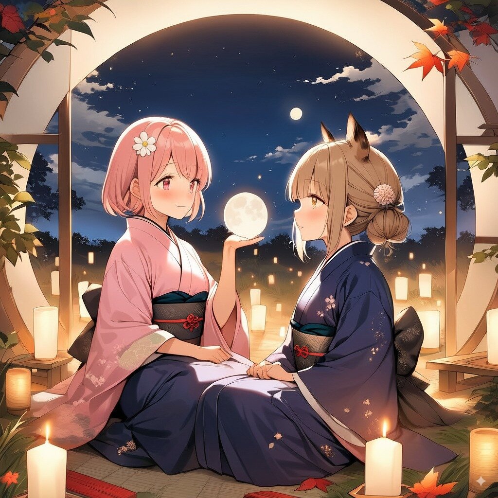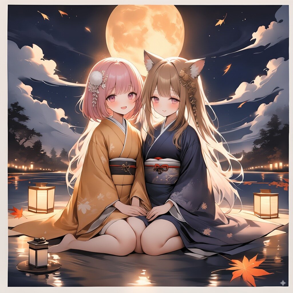 masterpiece, best quality, high detail, refined illustration, two girls sitting side by side on the ground, gazing at a large full moon in the night sky, traditional japanese moon-viewing scene, serene and elegant atmosphere, first girl: light pink hair, light pink eyes, loose wavy short bob hairstyle, floral hair accessory, happy smile, wearing a pale pink or lavender kimono richly decorated with kikyo, chrysanthemum, and autumn leaves, golden obi, soft and charming, second girl: light brown hair, long hair, amber eyes, small wild boar ears on head, calm and graceful expression, wearing a deep navy or indigo kimono adorned with susuki, hagi, flowing cloud patterns, and silver moon motifs, elegant and mystical, their kimono patterns softly shimmering under the moonlight, between them traditional moon-viewing items: tsukimi dango, sake, and susuki grass, background: clear dark night sky, realistic glowing full moon with visible lunar surface patterns, soft warm golden moonlight illuminating their faces and clothing, subtle warm reflection of light on the ground, quiet and refined atmosphere