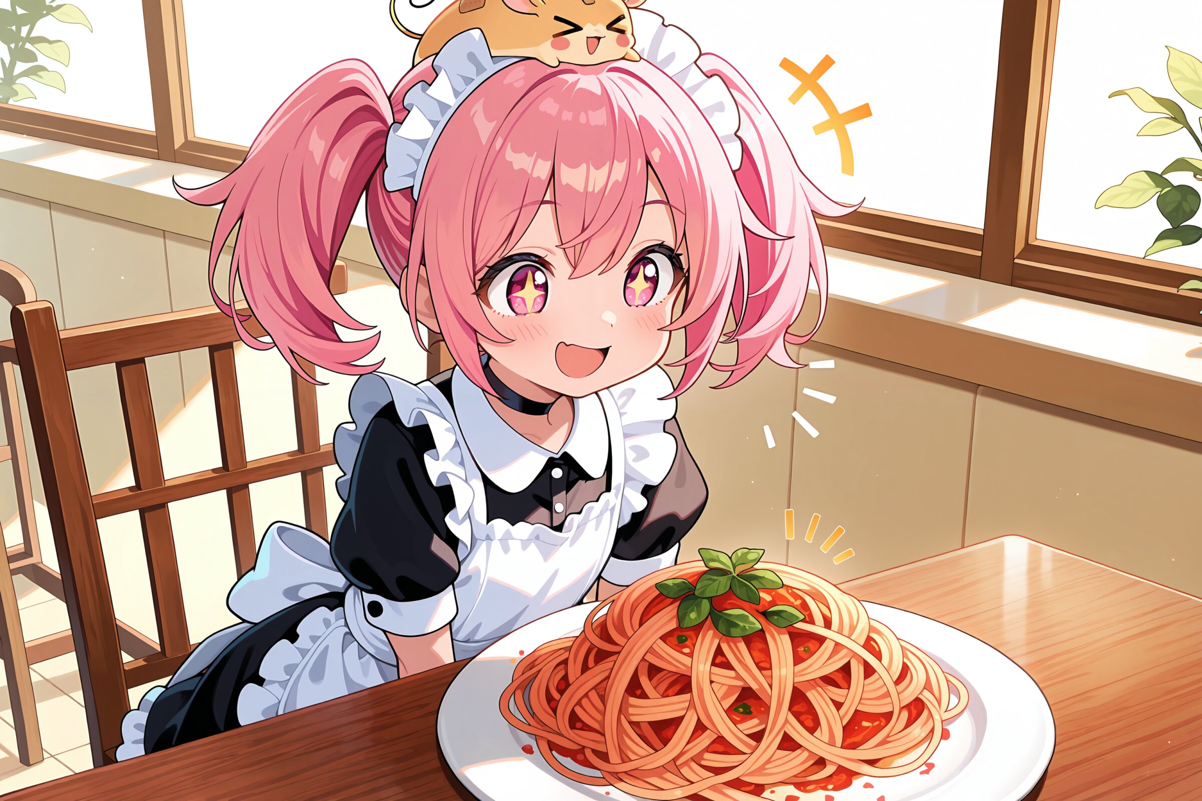 1 little girl, solo, diagonal angle, masterpiece, best quality, amazing quality, very aesthetic, pink hair, twintails, pink eyes, +_+, open mouth, smile, cheerful, +++, notice lines, choker, maid outfit, hamsters on her head, > <, pasta on table, sitting, in cafe,