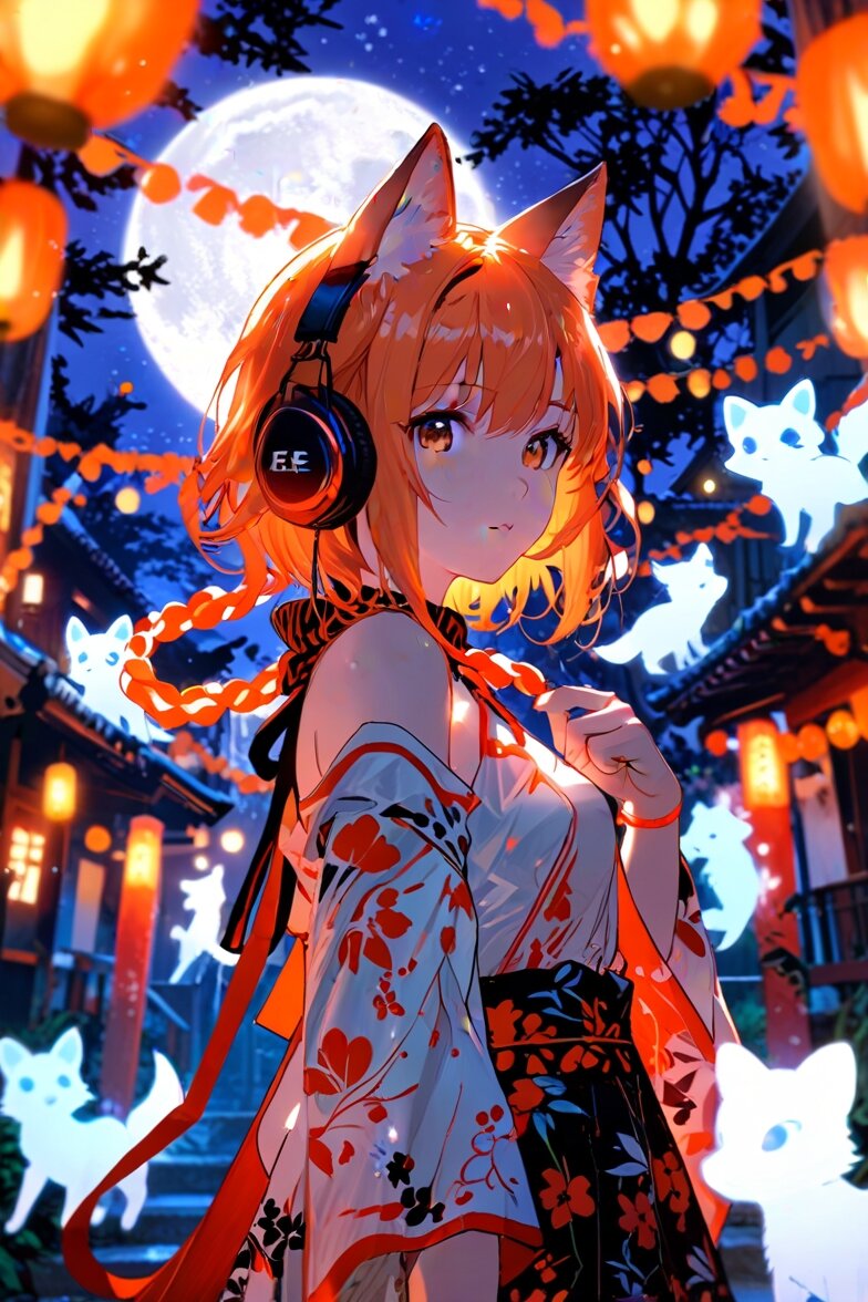 Ultra realistic (リアリティ:1.2), professional photography (プロカメラマン視点:1.3), dynamic wide-angle (広角:1.3), low angle idol composition (ローアングル:1.2), vibrant stage lighting (カラフル照明:1.4). Zena with (bright orange bob hair:1.3), (distinct orange headphones with subtle monkey-ear design:1.3), wearing a (modern off-shoulder miko-style blouse:1.3) and (short layered mini-skirt with shrine maiden patterns:1.2). Expression: (ポップで妖艶な笑顔:1.4), idol eyes sparkling with playful charm (輝き:1.4). Background: (Shinto shrine courtyard:1.3) under a (giant glowing full moon:1.5), decorated with (Halloween pumpkin lanterns:1.4), (colorful paper streamers:1.3), and (festival-style hanging lights:1.3). Behind her, a (nine-tailed fox aura:1.5) made of glowing orange, purple, and golden light trails swirls dynamically. Props & Effects: - (long red-and-white Chitose Ame candy sticks:1.5) held in one hand like a festive accessory. - (cute candy-shaped charms floating:1.4), (colorful confetti sparkles:1.4), (magical light ribbons:1.4). - (ghost silhouettes carrying candy bags:1.3). - Her shadow blends into (fox silhouettes:1.3) across the shrine ground. Pose: (idol stage pose:1.4), one hand lifted with (pumpkin lantern:1.3), the other elegantly presenting (Chitose Ame candy:1.5) as if offering sweets to the audience. Lighting: (silver moonlight spotlight:1.4), (stage lights in neon orange, purple, and pink:1.5), (rim light highlighting orange bob:1.3). Overall mood: (九尾の狐の神秘:1.5), (