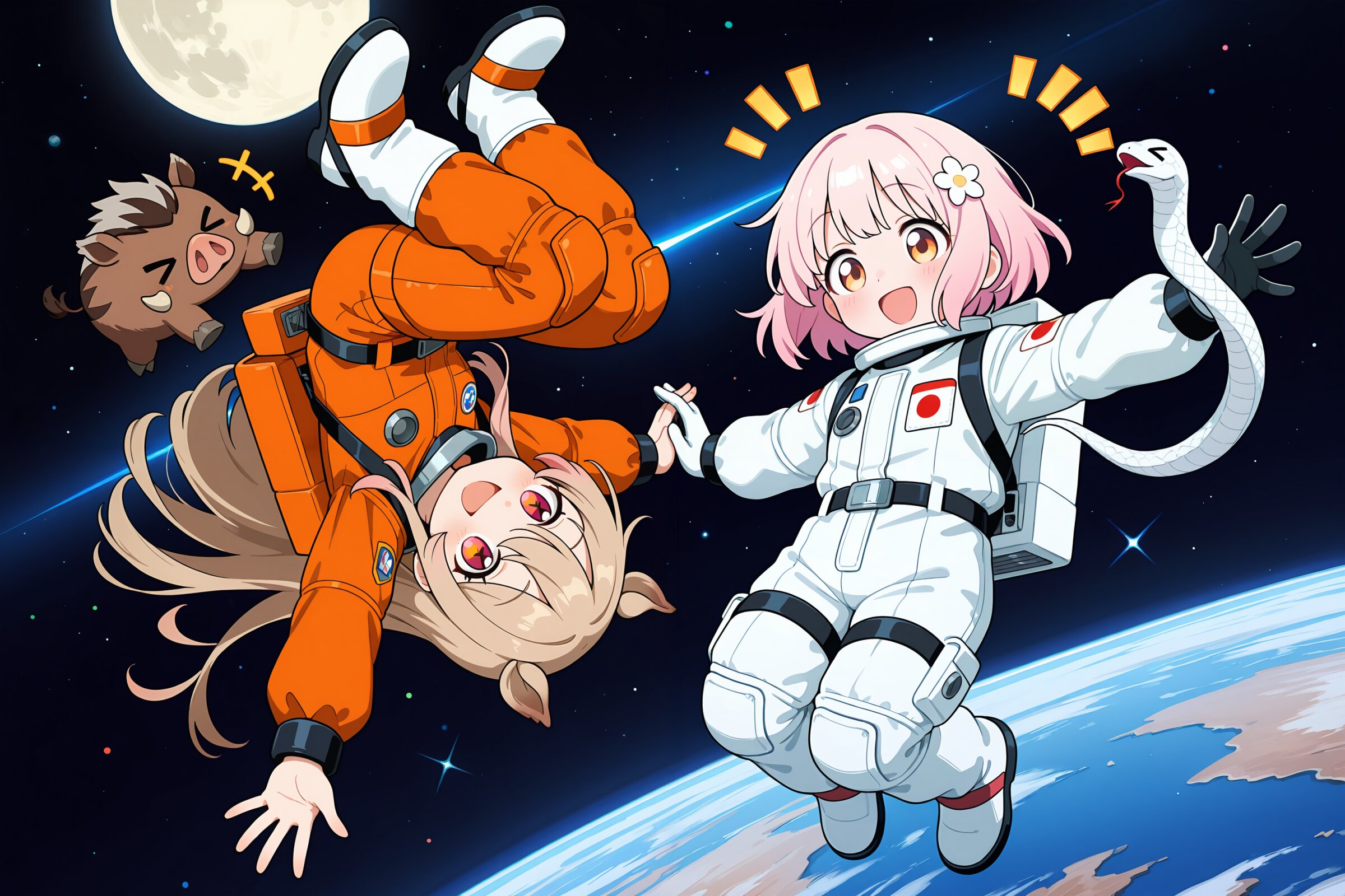 2 little girls, rotational symmetry, symmetrical pose, hi touch, masterpiece, best quality, amazing quality, very aesthetic, light brown hair, long hair, amber eyes, (wild boar's ears:1.2), happy smile, open mouth, cheerful, notice lines, +++, astronaut outfit, no headwear, little wild boar, > <, floating, dynamic pose, japanese flag, (on space:1.2), moon face, ADDCOL 2 little girls, rotational symmetry, symmetrical pose, hi touch, masterpiece, best quality, amazing quality, very aesthetic, light pink hair,light pink eyes, loose wavy hairstyle, short bob cut,floral hair accessory, happy smile, open mouth, cheerful, notice lines, +++, astronaut outfit, no headwear, little white snake, (> <:1.2), floating, dynamic pose, japanese flag, (on space:1.2), moon face,