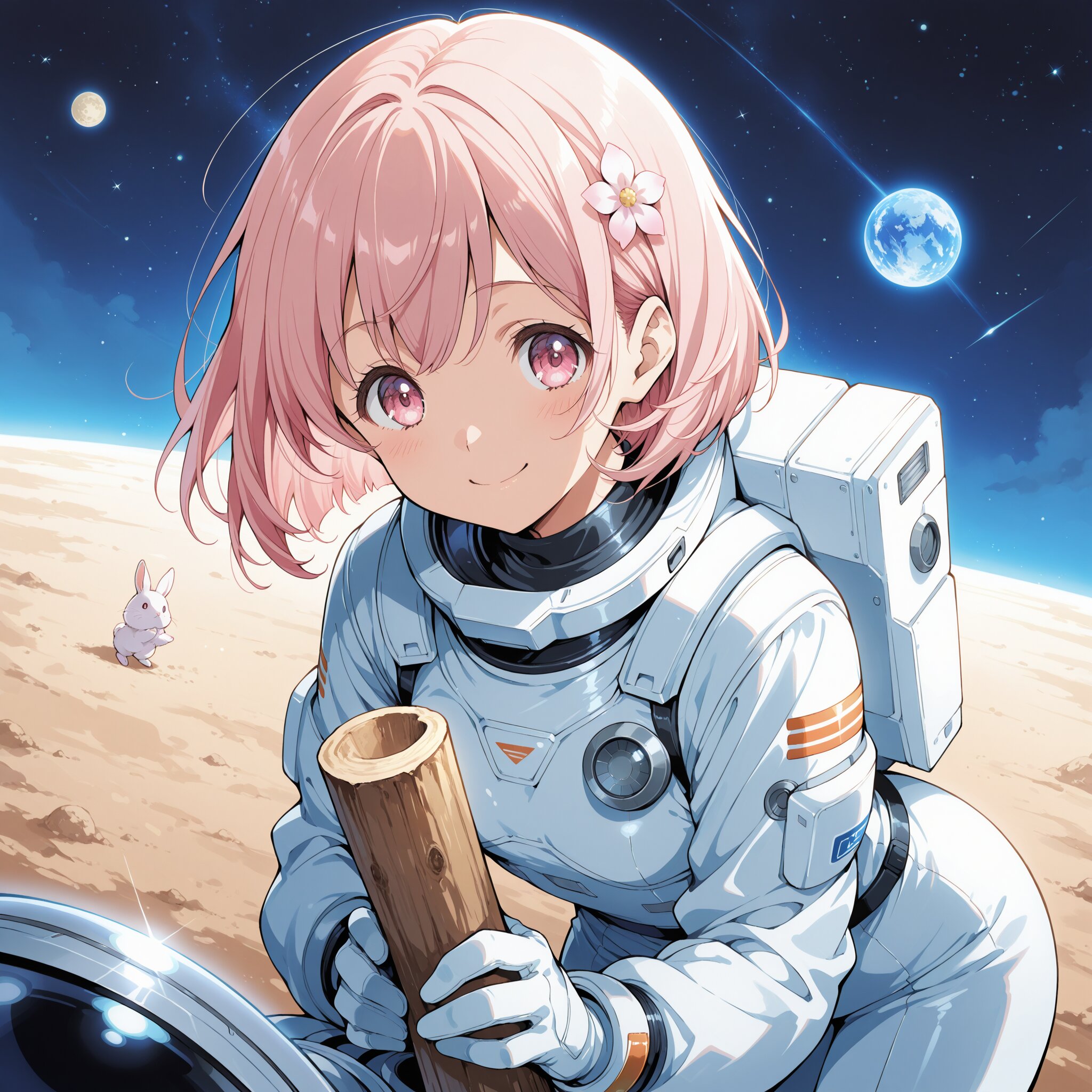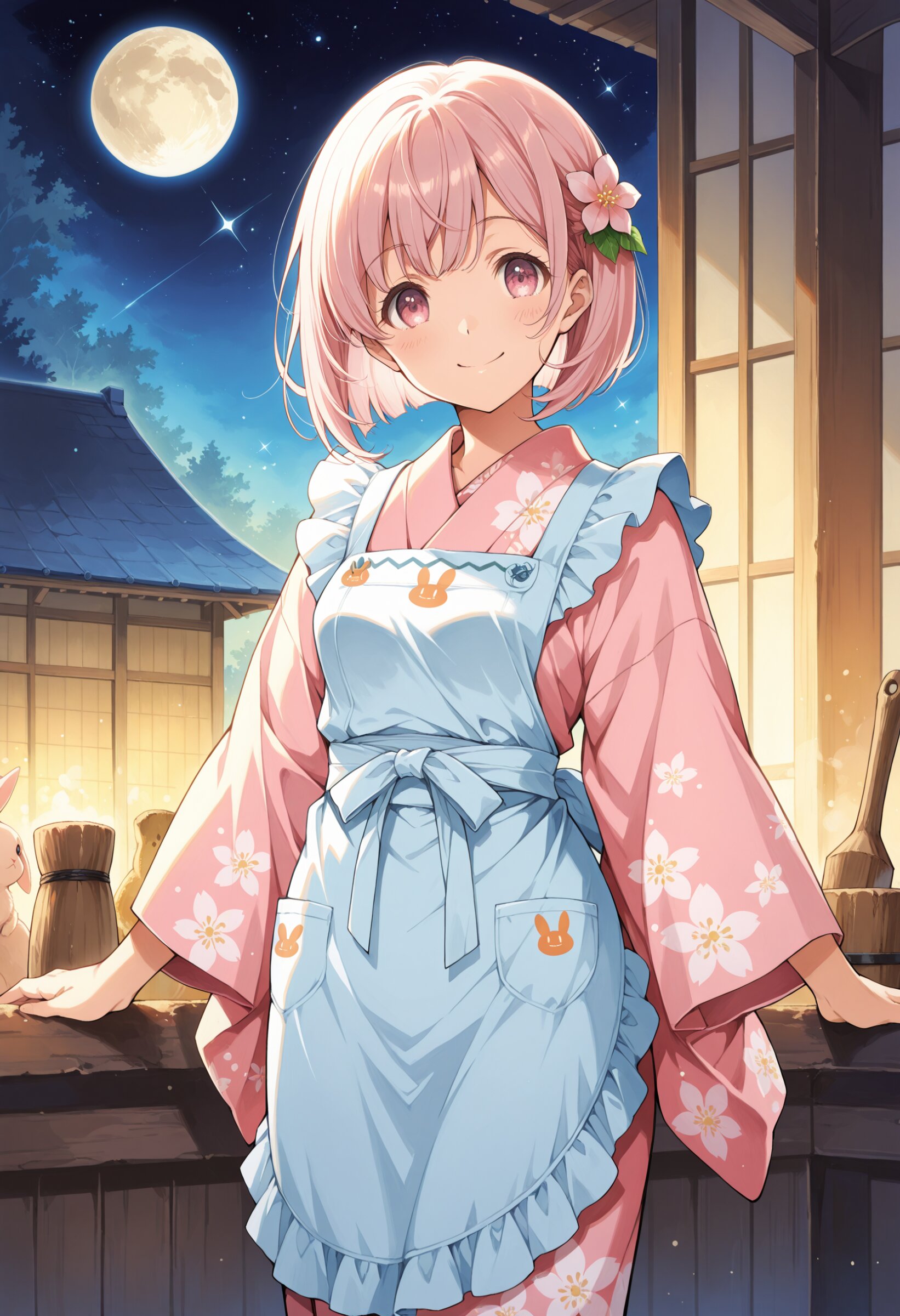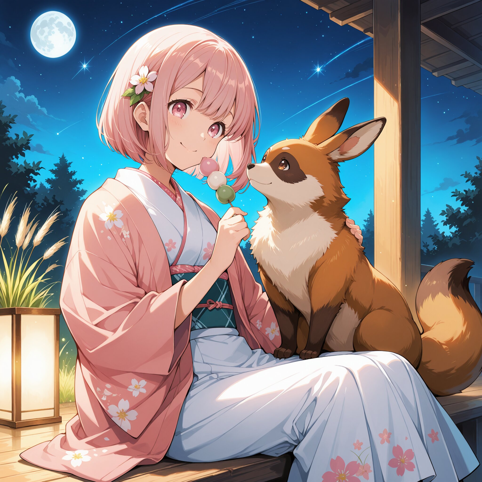 masterpiece,best quality,amazing quality,general, fine detail, official art, 1girl, cute face, On a traditional Japanese wooden porch (engawa) in a quiet garden, under the night sky with a bright full moon, a girl with light pink hair, light pink eyes, a loose wavy short bob cut, a floral hair accessory, and a happy smile is sitting with a fox, a raccoon dog, and a rabbit. They are enjoying eating traditional Japanese dango together, sharing a peaceful and heartwarming moon-viewing moment. The animals look cute and friendly, sitting close to the girl, happily eating. The garden is softly lit by the glowing moonlight, with gentle shadows, pampas grass swaying, and sparkling stars in the sky. Highly detailed, anime style, warm and cozy atmosphere, dreamy illustration.
