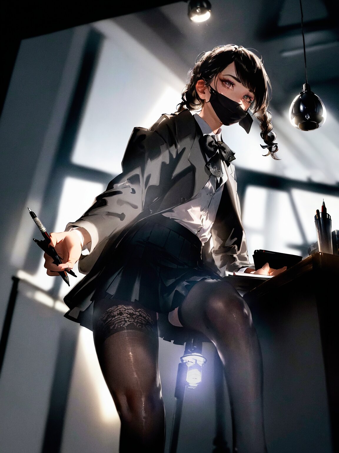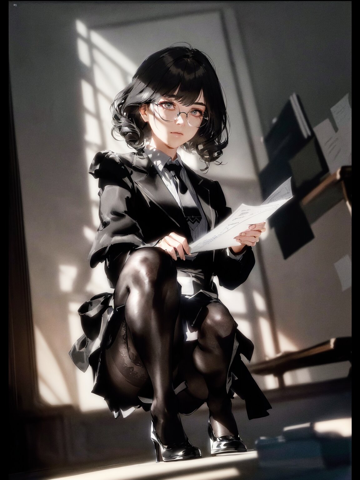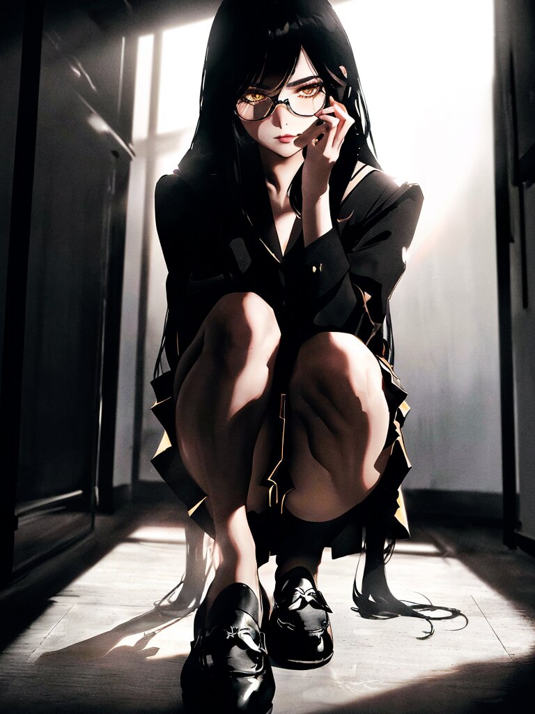 ((8k,delicate facial features, ultra high res, best quality, masterpiece:1.2,perfect anatomy:1.1,super detailed skin,textile shading,)) 1girl,((squatting,kneeing on one leg,pick up dropped documents and pens,))black fishnet pantyhose,yellow eyes,from below,corridor,black sailor uniform,black pleats mini skirt,loafer,strong light coming in,full makeup,glossy black very long hair,glasses,(cinematic lighting,cinematic shadows,cinematic angle,cinematic pose,)