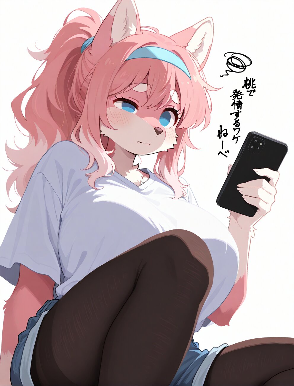1girl, furry, pink wolf ears, snout, fluffy body, wolf fluffy fur, (huge breasts:1.3), narrow waist, wide hips, thick thighs, pink hair, messy hair, long hair, ponytail, multicolored hair, colored tips, (white tips:1.1), white thick eyebrows, raised inner eyebrows, tareme, blue eyes, no pupils, blue hairband, layering, closed mouth, white shirt, half sleeves, blue denim shorts, black pantyhose, pantyhose under shorts, knee up, indian style, hand up, arm at side, holding a smartphone, wince, uneven eyes, squiggle, (shade), white background, foreshortening, perspective, saturated, smooth, looking at smartphone, looking ahead, simple background, (oekaki:1.1), (vibrant high contrast:1.2), stylized, kawaii, cute, 2D, masterpiece, simple, two tone fur, furry body, detailed face, high quality, animal ears, solo, flat color style, simple coloring style, Bright colors, Contour line, pale painting, gddw, fine fabric emphasis, (detailed_hands:1.5), flat color, no lineart