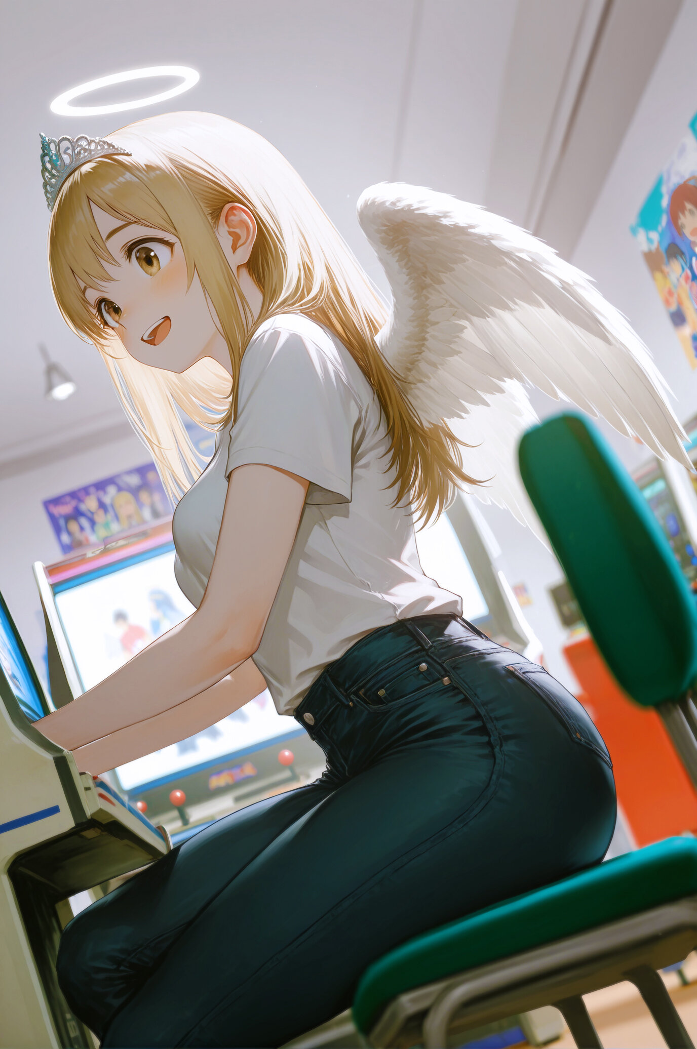 masterpiece, best quality, absurdres, 8k, ultra detailed, aesthetic, very aesthetic, newest, <lora:Fixhands_anime_bdsqlsz_V1:0.5>, <lora:bold-16oa:-0.5>, (realistic:0.3),BREAK (shallow depth of field,Gaussian Blur:1.6),lens flare,1girl, sitting,excited,happy,smile,modern clothes,pants,t-shirt,short sleeves, <lora:game_center_SDXL_V1:1>(game_center, scenery, japan, arcade cabinet, scenery, chair, indoors, poster (object),),playing game, ,(tareme:1.3),blonde hair, long hair, brown eyes, (white angel wings:1.2),tiara,french bride,from below,side view,(cowboy shot,from front,wide angle,wide shot:1.3),open mouth, (medium breasts,curvy:1.3), <lora:USNR STYLE_XL_loha:0.8>