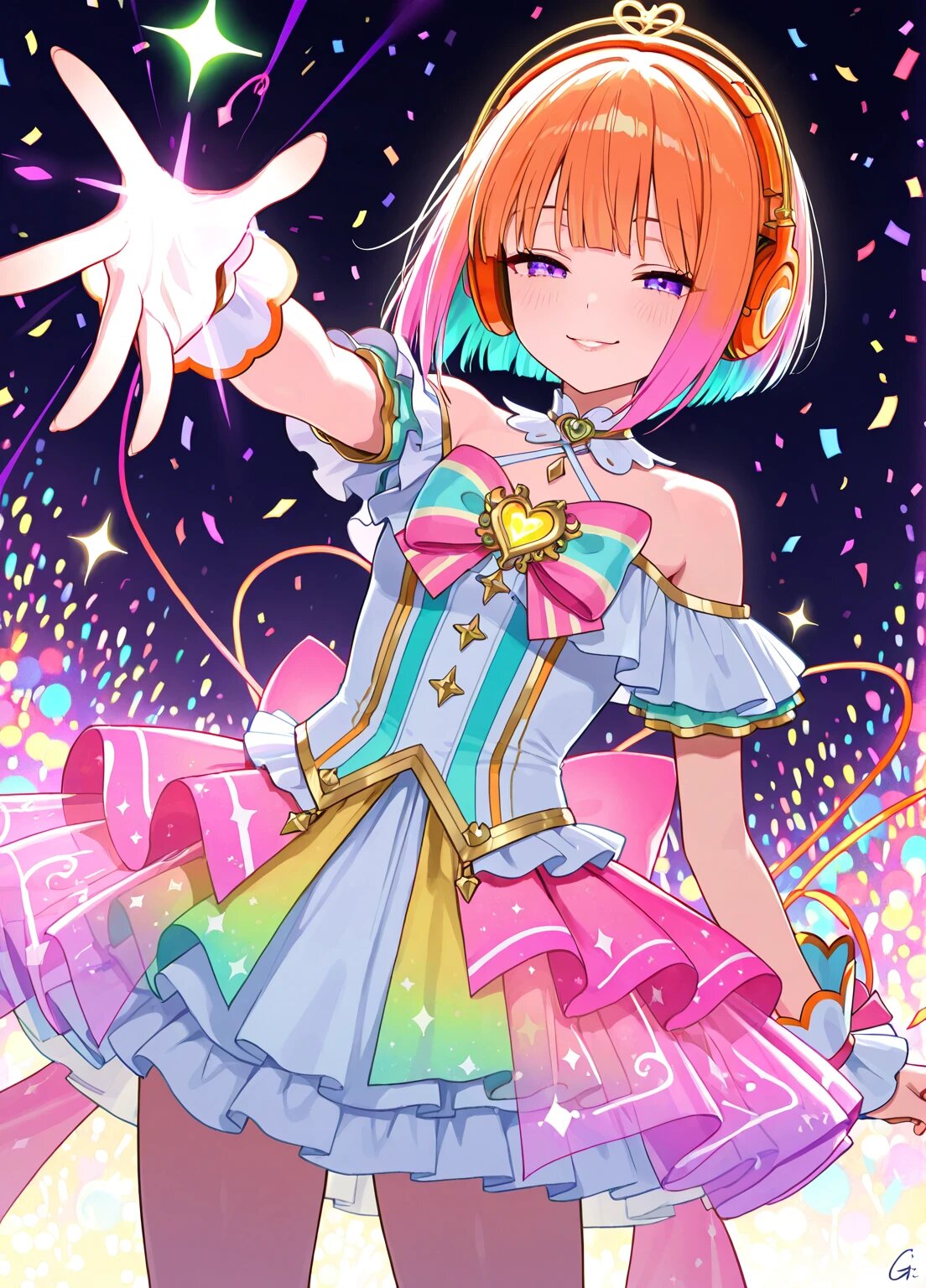 cinematic hyper-detailed fantasy, masterpiece 8K:1.5, movie still:1.4, professional photographer’s perspective:1.6, Zena:1.6, pastel orange bob haircut shining with candy-colored highlights:1.3, signature orange headphones with small monkey-ear motif glowing neon pink:1.3, idol outfit:1.4 vibrant pastel tones, shimmering translucent fabric:1.3, off-shoulder elegant design with layered mini-skirt:1.3, rainbow jewel embroidery shaped like magical runes:1.3, background: dazzling stage of rainbow stained glass:1.4, glittering balloons, neon confetti, glowing pastel sweets floating in the air:1.5, surroundings: prismatic ribbons:1.3 and radiant heart-shaped flares:1.3 swirling around, fairy-like candy lights fluttering:1.3, her expression: dangerously alluring with half-closed eyes:1.6, lips curled into a subtle devilish smile:1.5, gaze brimming with decadent temptation:1.6, pose: one hand reaching outward as if inviting the viewer into forbidden delight:1.4, the other resting softly near her lips in mock innocence:1.4, lighting: colorful cinematic spotlights:1.4, prismatic lens flares:1.4, glowing sparkles like sugar dust:1.3, mood: vibrant idol atmosphere with overwhelming pop color, yet beneath it all lurks the corruptive beauty of Lust itself:1.6