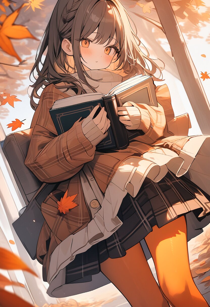 best quality,absurdres,8k,ultra detailed,very aesthetic,1girl,(rating: general:1.2),autumn,plaid,hug book,orange tights,Dutch angle,