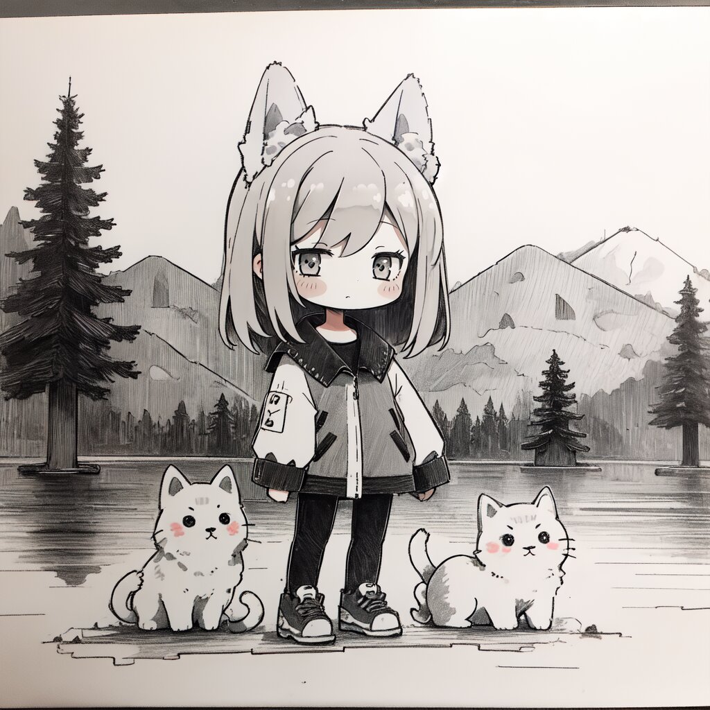 best quality,(limited palette,graphite \(medium\):1.2),traditional media,wide shot,nostalgia, (solo,1girl,chibi:1.2),cat ears, outdoors,landscape,scenery, <lora:fineline_v1:1.0>