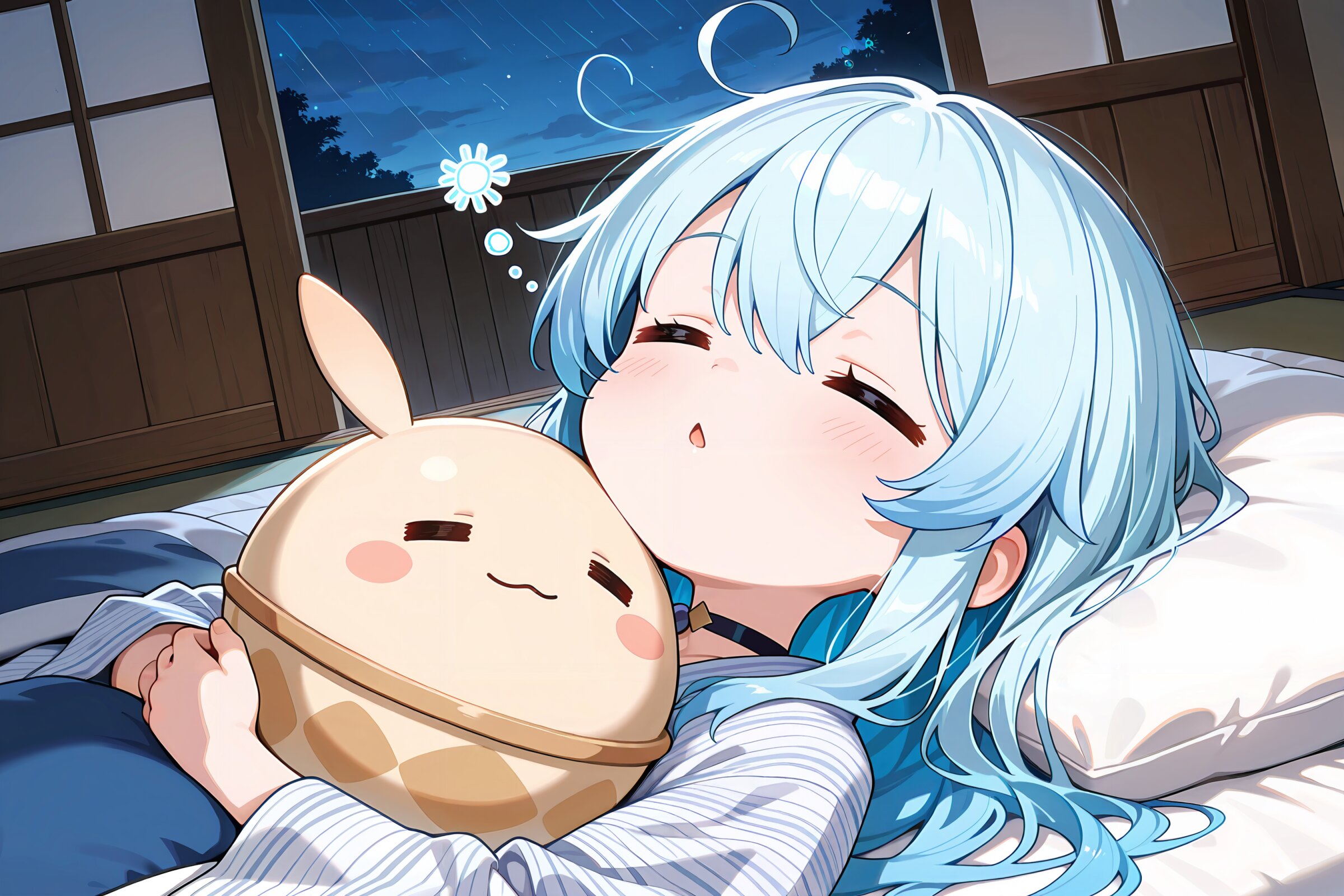 1 little girl, solo, upper body, diagonal angle, masterpiece, best quality, amazing quality, very aesthetic, sky blue hair, long hair, closed eyes, =_=, chestnut mouth, smile, cheerful, relaxing, Squeans, spoken Squeans, choker, yukata, lying, sleeping, holding humpty dumpty, =_=, futon, rainy sound,
