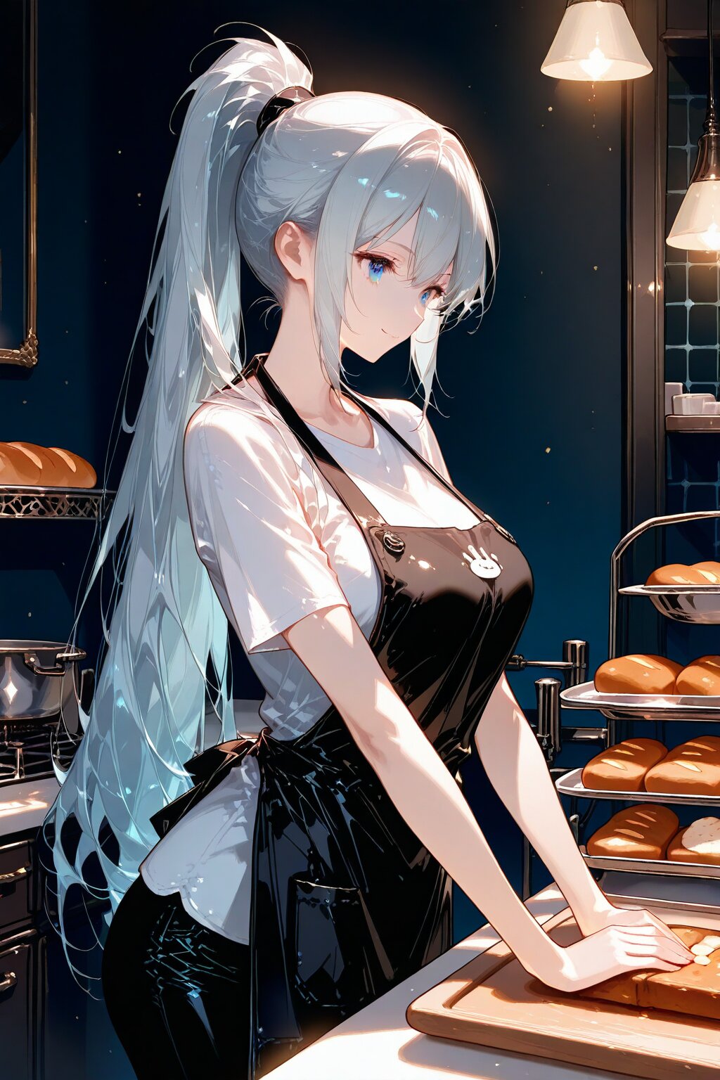 (best quality),(masterpiece),(ultra detailed)1 lady, long ponytail, blue eues, , (silver hair), ( white shirt, black apron, black pants),smile gently, cowboy shot, (baking bread)