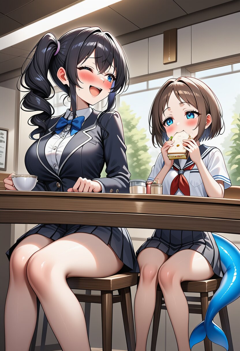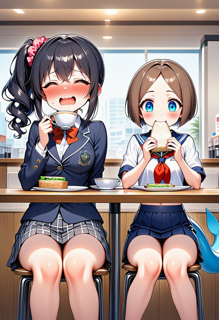 ai-generated, year 2024, anime style, 2girl, yuri, midday, sitting on chair side by side front of counter table, indoor, 1.0::in modern cafeteria::, , dynamic angle, masterpiece, best quality, ultra detailed, perfect fingers, high resolution, absurdres, perfect anotomy, detailed background, unity 8k wallpaper, -2.5::looking at viewer::, very aesthetic, masterpiece, no text