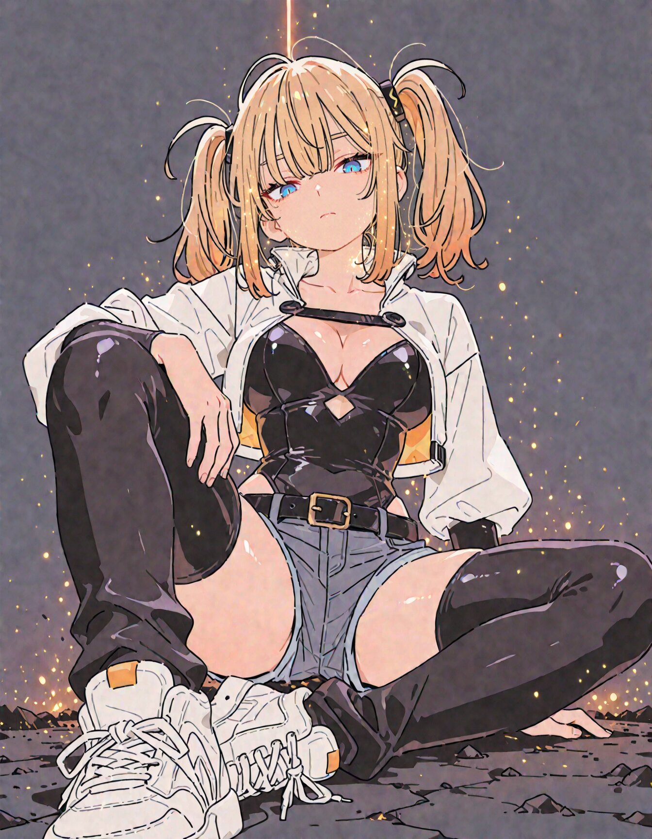 (from below,looking down:1.2) looking at viewer, 1girl, mature female,, blonde hair, medium hair, messy hair, twin tails, high twin tails, big hair, straight hair, black string hair clip, long bangs, bangs covering eyebrows, long sidelocks, blue eyes, tsurime, sanpaku, black leotard, highleg leotard, leotard bikesuit, center opening, collarbone, cleavage, center boob, boob, white open jacket, cropped jacket, popped collar, three-quarter sleeves, sleeves pushed up, center opening, midriff, black arm warmers. (dark grey shorts:1.1), denim shorts, black belt, (leotard under clothes:1.1), black leg warmers, black thighhighs white sneakers, figure four sitting, (simple background:1.0), (burnt sienna background:1.0), masterpiece, best quality, amazing quality, very aesthetic, absurdres, newest, you can add scenery, (volumetric lighting), To make the background more distinctive. professional art lots of details, , overexposure, shiny-glistening, (watercolor style:0.0), (pastel color style:1.0) 4ur4_illu,shiny, glowing, glowing particles, glowing light particles, light particles, <lora:noline (1):-0.5> <lora:sdxl2-flat2-512b:0.15> <lora:facelightup_xl_v10:0.5> <lora:V2_yakumo_alchemy:0.5> <lora:Aura_illu:0.1>