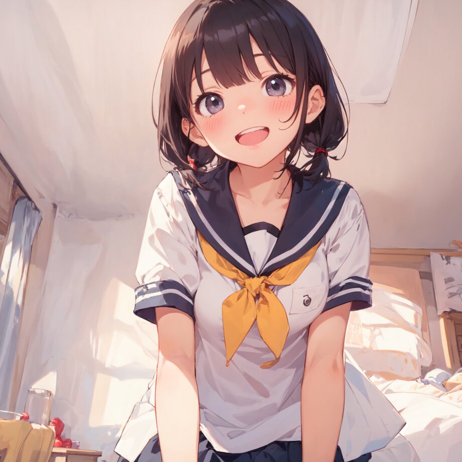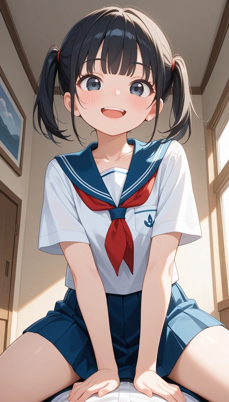 masterpiece, best quality, in child room, morning, 1girl, light smile, open mouth, leaning forward, Horse riding, junior high school student, loli face, younger sister, blushing cheeks, staring at viewer, worried face, summer clothes, white short-sleeved sailor uniform, short hair, short twin tail, bangs, forehead, black hair, medium breasts, black eyes, red necktie, miniskirt, getting face close to viewer, trying to wake up sleeping viewer, loves the viewer