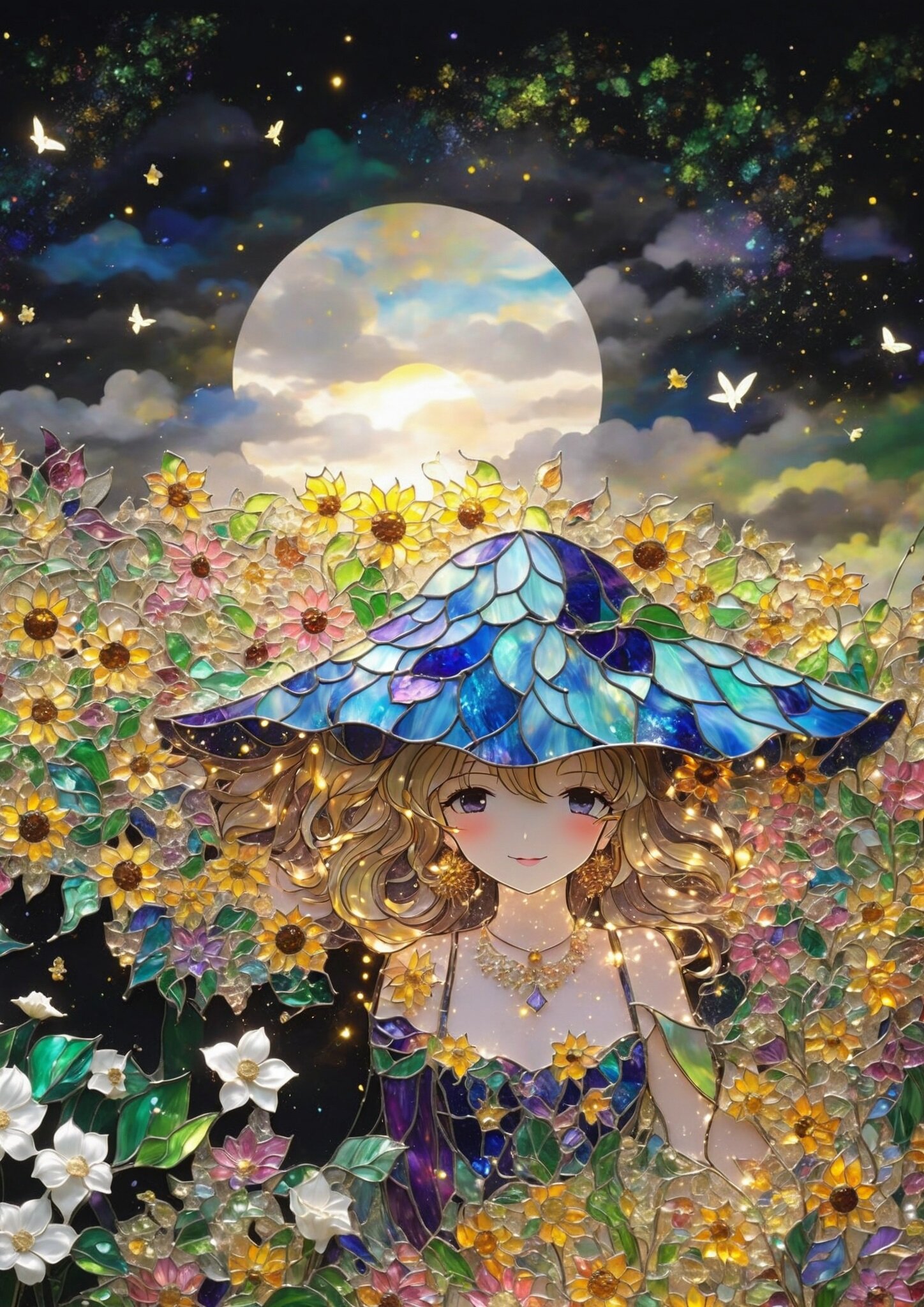 masterpiece, best quality, animation style, anime colored, illustration, A vibrant, summer-inspired stained glass artwork featuring a blooming sunflower (weight: 2.2) near the sea, surrounded by colorful fogs and glowing magic particles. Over 20 fireflies dance in the scene, casting soft light particles that enhance the vivid, radiant colors. A straw hat rests gently near the sunflower, adding a summery touch. The composition is bright, uplifting, and awe-inspiring, with intricate stained glass patterns that capture the essence of summer, evoking joy and wonder. (No human figures included:2.2)