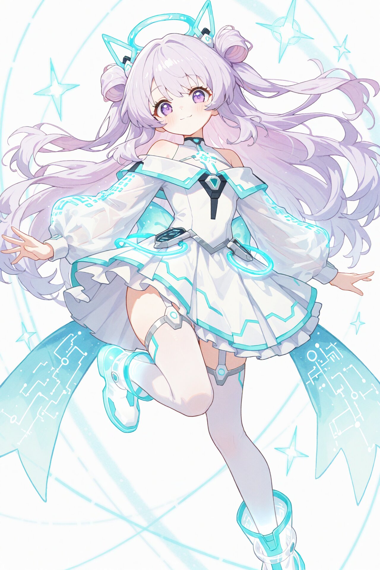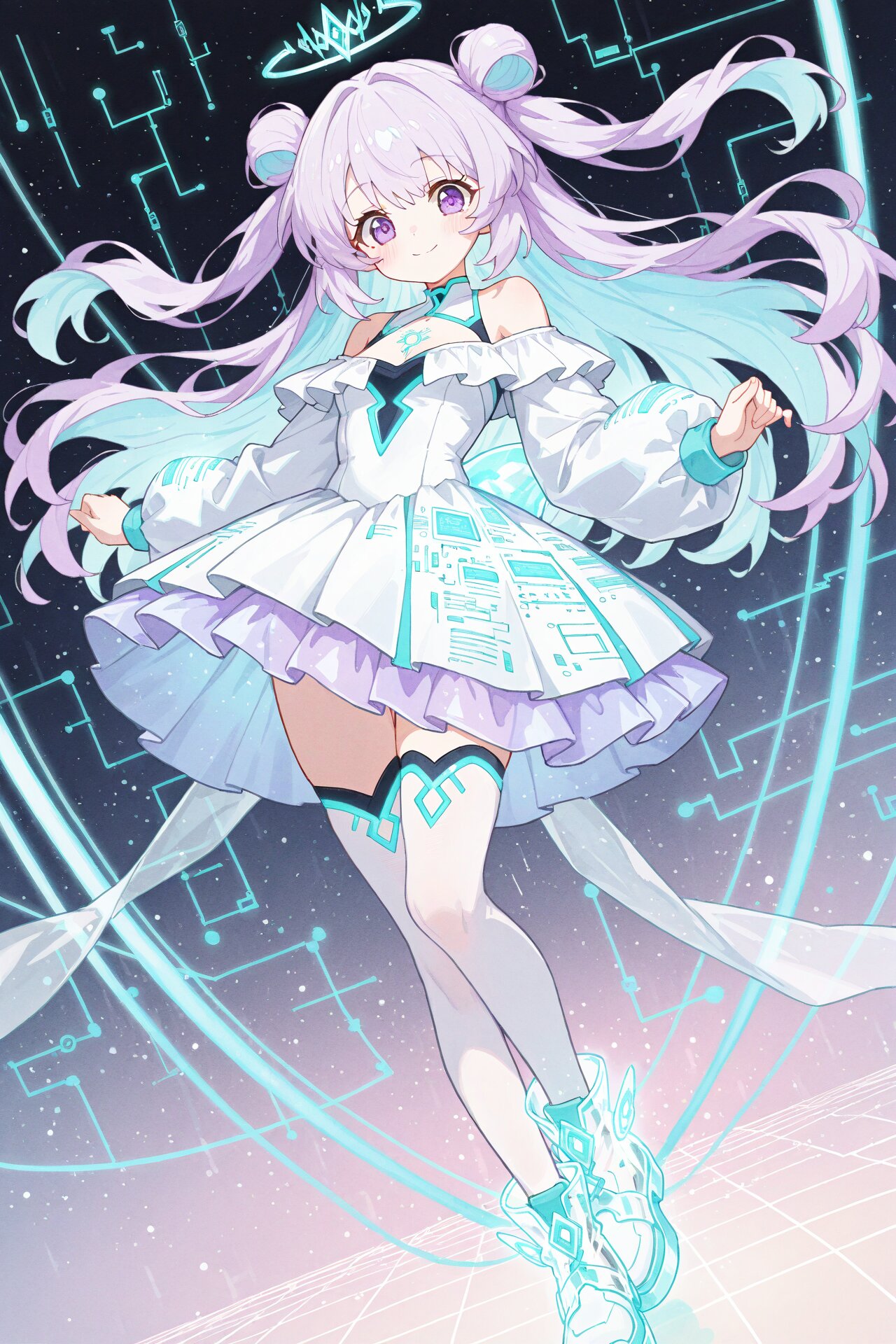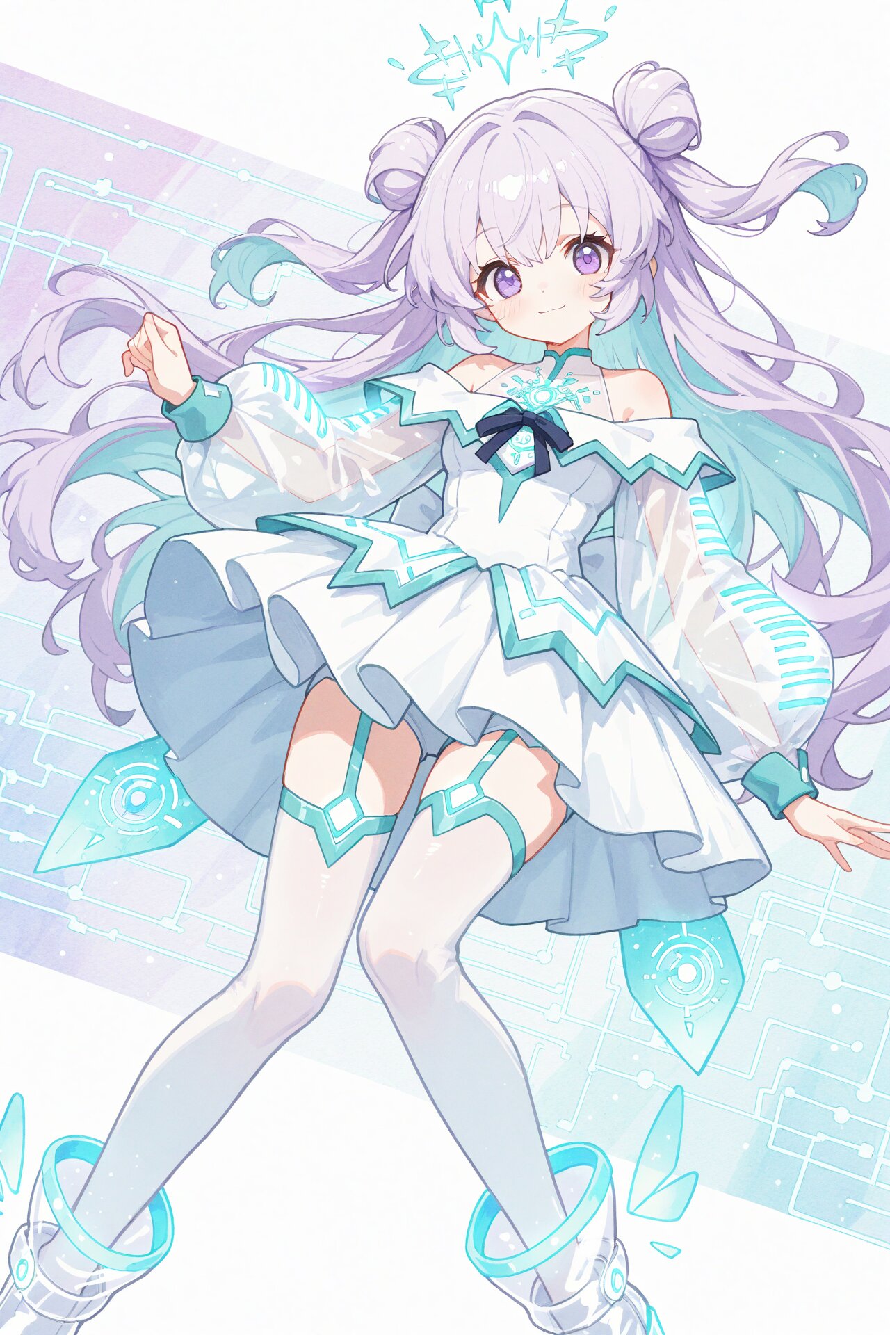 (soft pastel color palette1.5), (pale colors:1.5), watercolor texture, matte finish, subtle shading, minimal contrast,, masterpiece、best quality、amazing quality, solo, kawaii, cute, dynamic pose, dynamic angle, looking at viewer, Pastel color palette, (Upper body: 0.9), soft cute girl with soft lavender hair and light blue inner highlights, long hair with two side buns and loose curls, one stray hair, large, bright purple eyes, a gentle smile, a faint glow, anime-style with emphasized contours, flat pastel-toned shading., futuristic idol outfit, elegant white one-piece dress, glowing cyan circuit-like lines, short flare skirt with glowing geometric patterns, sheer off-shoulder top, transparent puffy sleeves with glowing accents, high neckline with light-blue glowing trim, bodysuit-style underlayer with luminous seams, thigh-high stockings with glowing light rings near the top, transparent ankle boots with glowing soles, subtle holographic shimmer, luminous and refined design, pulsating light patterns