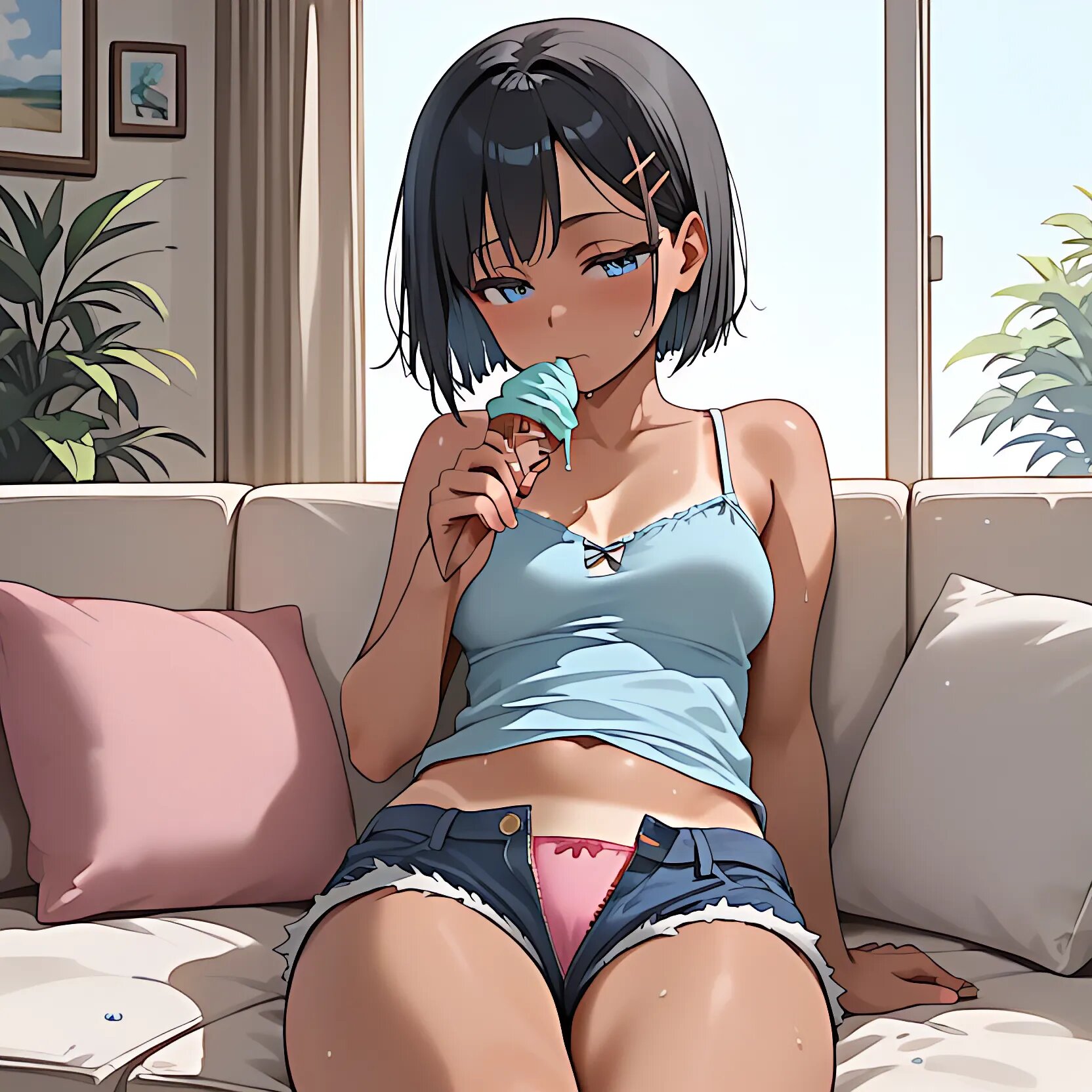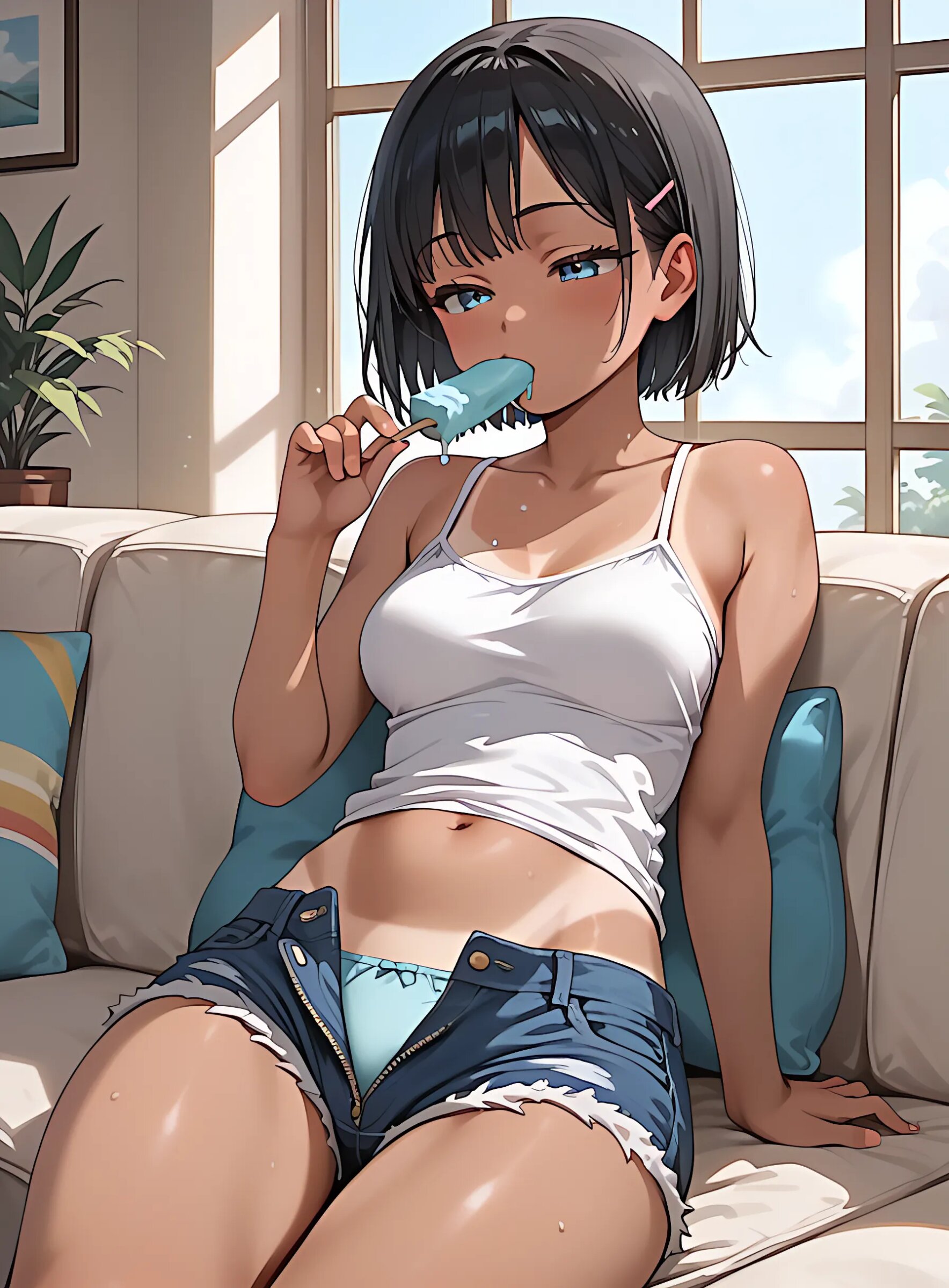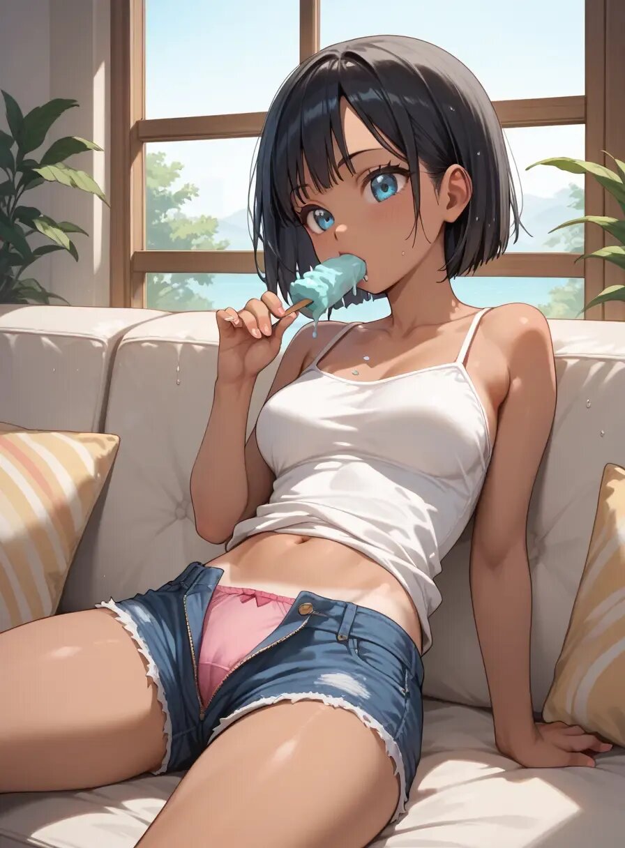 Summer, daytime, living room, large window, cumulonimbus clouds reflected outside the window, a girl sitting on a white sofa, a girl eating a light blue ice cream, a white camisole with three light blue water droplets on it, denim shorts, open-zip shorts, panties,1girl,mesugaki,early teen,loli,tan,slender,black hair,short hair,medium breasts,narrow_waist,giggling,lying,,tanlines,open_fly,sleepy,light_blush,sweat,bare shoulders,