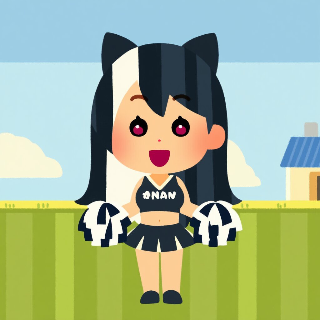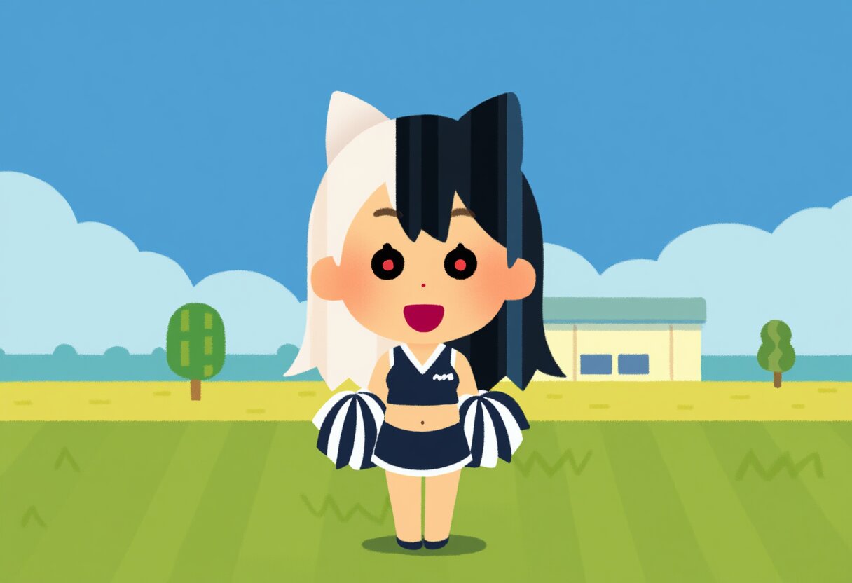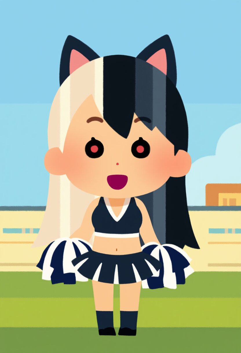 {{{masterpiece}}}, {{{best quality}}}, {{ultra-detailed}}, {illustration}, {{an extremely delicate and beautiful}}, {{{{{irasutoya}}}}}, {{{{chibi, chibi style, chibi only}}}}, {{flat collar}}, 1girl, solo, red eyes, {two-tone hair:1.5}, {black and white hair}, {{two-tone hair, white hair, black hair}}, long hair, straight hair, hair between eyes, {{{cat's ears}}}, medium breasts, {{slender}}, open mouth, {{happy}}, navel, {{cheerleader}}, {{wearing black cheerleader costume, skirt, black shoes}}, {{{holding a white and black pompon}}}, blue sky, grasslands, {{school, school building}}, outdoors, facing the front, looking at viewer, straight-on, close to viewer, full body, solo focus
