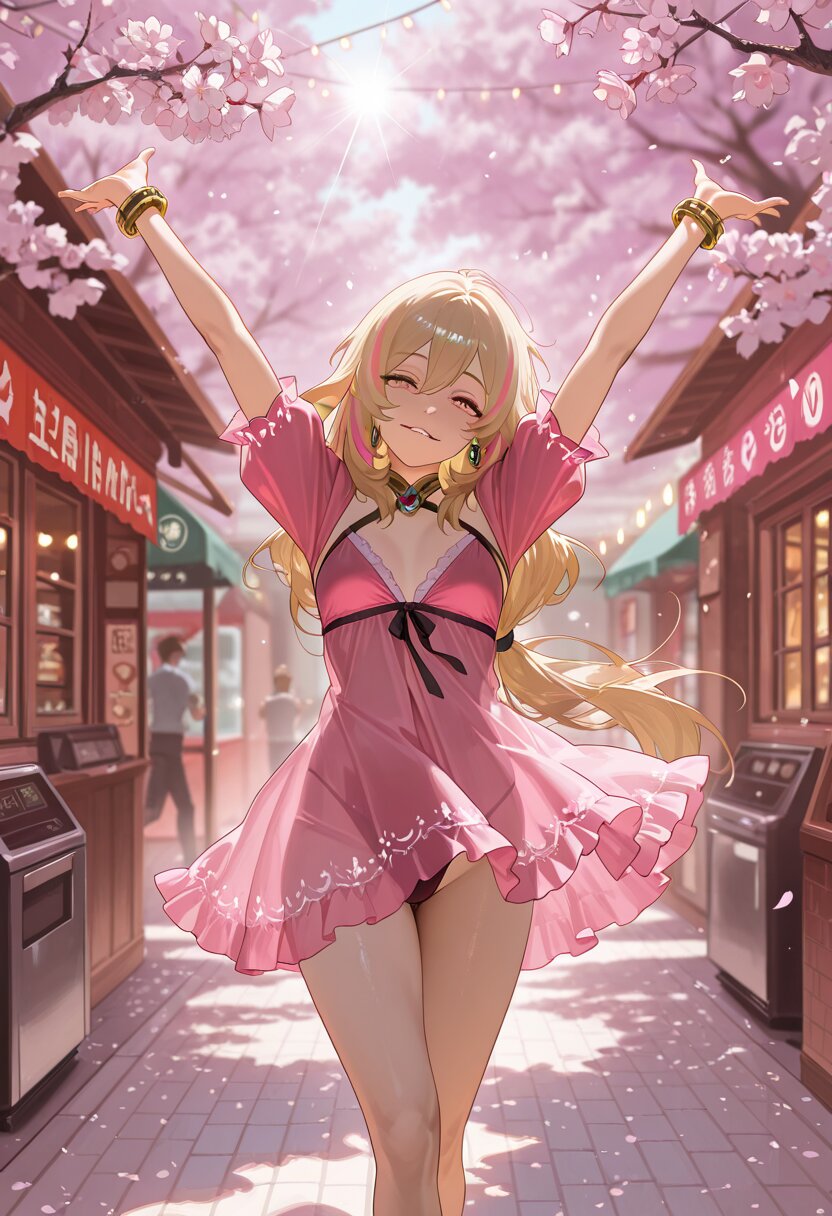 (1girl),(Expressiveh),masterpiece, best quality, amazing quality, very aesthetic, high resolution, ultra-detailed, absurdres, newest, scenery,tall and graceful, small breasts, very long hair,pink linen mini puff-sleeve babydoll, with metal rings, high-leg cut,running, three-quarter view, head tilt, enthusiastic cheering with group participation: cheer with excitement your arms raised in the air and joined by others conveying collective enthusiasm and support., crossing legs and tilting head coyly, bust-up shot, biting lower lip, doe-eyed look, upward gla,,quiet back alley, window daylight, string lights, polished marble, falling cherry blossoms, morning light, lens flare, ramen shop counter, k,noon brightness, high-contrast look, three-quarter shot, soft skin highlights,,,BREAK, depth of field, volumetric lighting