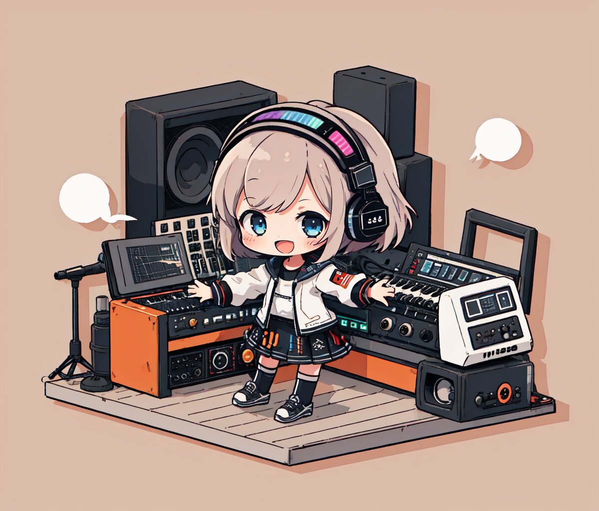 best quality, (solo,1girl,chibi:1.2),idol costume,:d,musical note, indoors,(recording studio isometric:1.1),wooden wall,mixing console, <lora:fineline_v1:1.0>