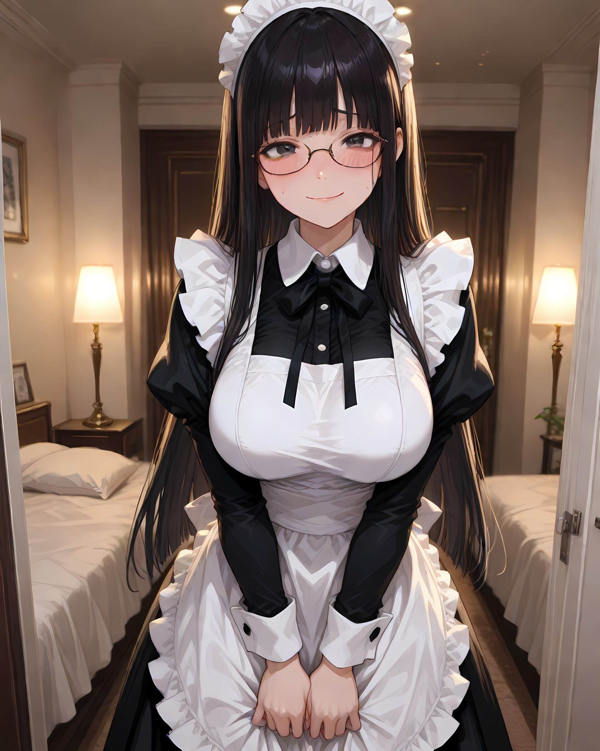 <lora:hyper_sdxl_8_step_lora_f16:1>,, 1girl, standing, in hotel, bed, focus on face, BREAK 18 years old, girl, long straight black hair, blunt bangs, large breasts, maid, apron, glasses, Nervous smile, forced smile, blush, BREAK masterpiece, amazing quality, best quality, ultra-detailed, 8K, dramatic lighting,