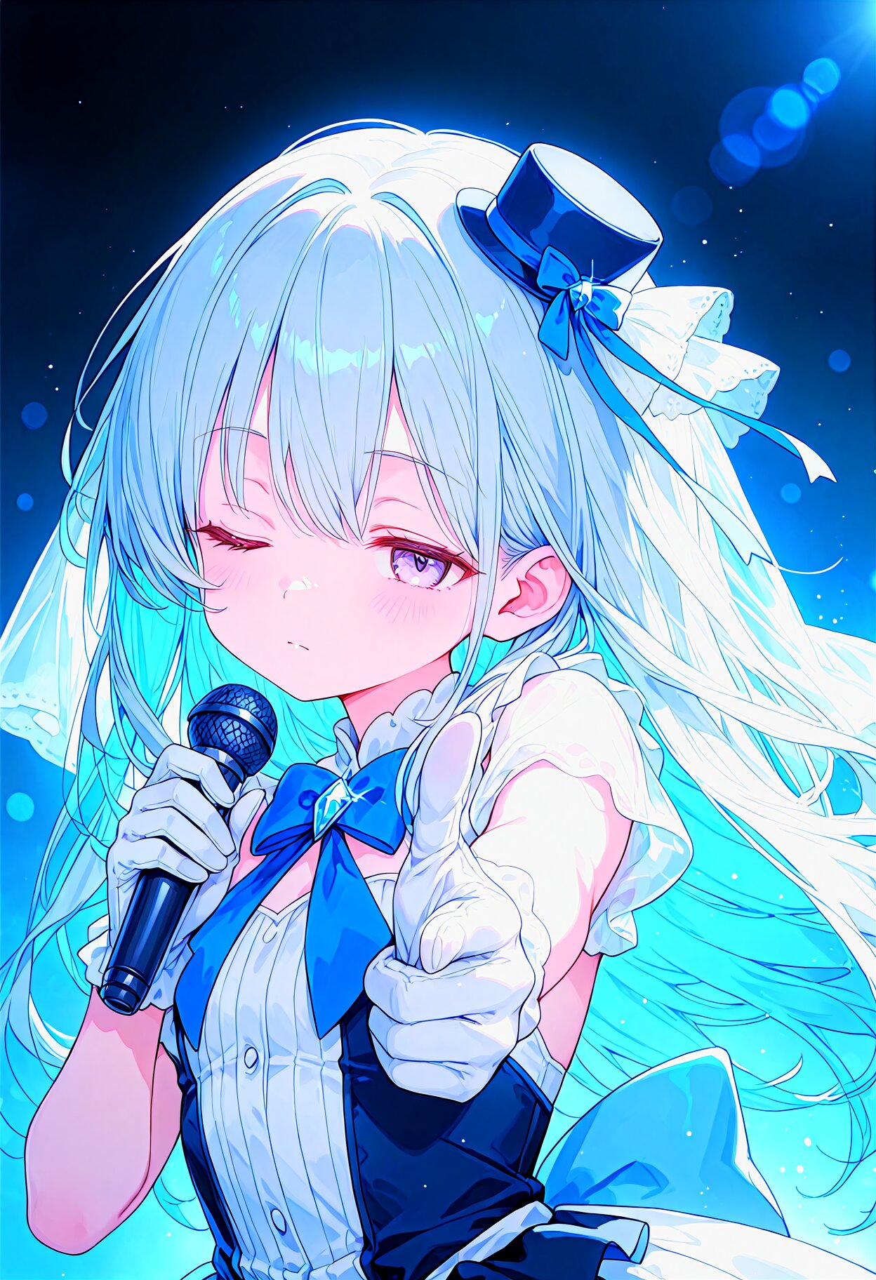 beautiful detailed background, best quality, pale color,pastel colors, blue theme, (backlighting,:0.9) cinematic light, 1girl, , solo, bokeh, lens flare, sparkle, upper body, one eye closed, parted lips,Expressionless, big eyes,(half-closed eyes,:1.1) tareme, pale purple eyes, (silver hair:1.1), (dark blue hair colored inner hair:0.8), long hair, eyebrows visible through hair, see-through veil, (one mini hat:0.9), blue strapping ribbon and bow, white gloves, closed mouth, bow, idol, one hand up, reaching towards viewer, white and (darkblue:1.2) two-tone dress, (see-through,:0.8) finger gun, crystal, microphone, holding, <lora:noline-16oa:-1.25> <lora:sdxl2-flat2-512b:-0.8> <lora:LECO_BadHands:-2.2>