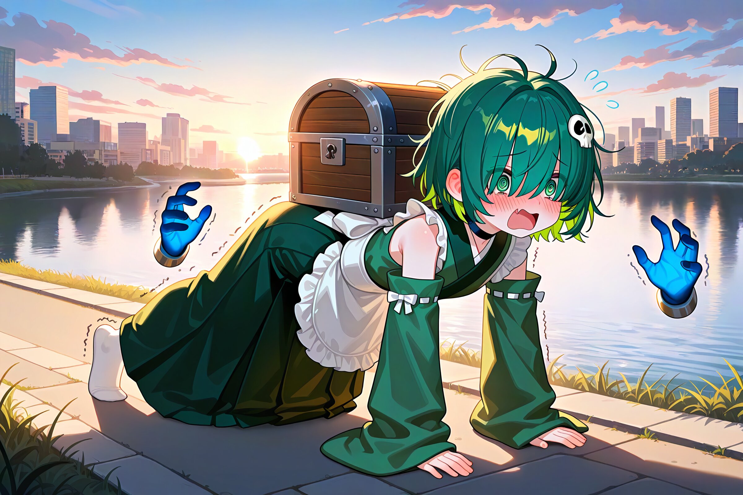 1 little girl, solo, masterpiece, best quality, amazing quality, very aesthetic, cobalt green hair, short hair, messy hair, (hair over eyes:1.2), green eyes, demon fangs, @_@, chrstnut mouth, troubled, tearful, trembling, blush,flying sweatdrops, choker, green wa maid outfit, (oversized sleeves:1.2), detached sleeves, skull hair ornament, long skirt, push-ups, carrying treasure chest on her back, (floating black ghosty hands:1.2), early morning, sunrise, river, riverside, embankment, city, buildings, sky, clouds, road,