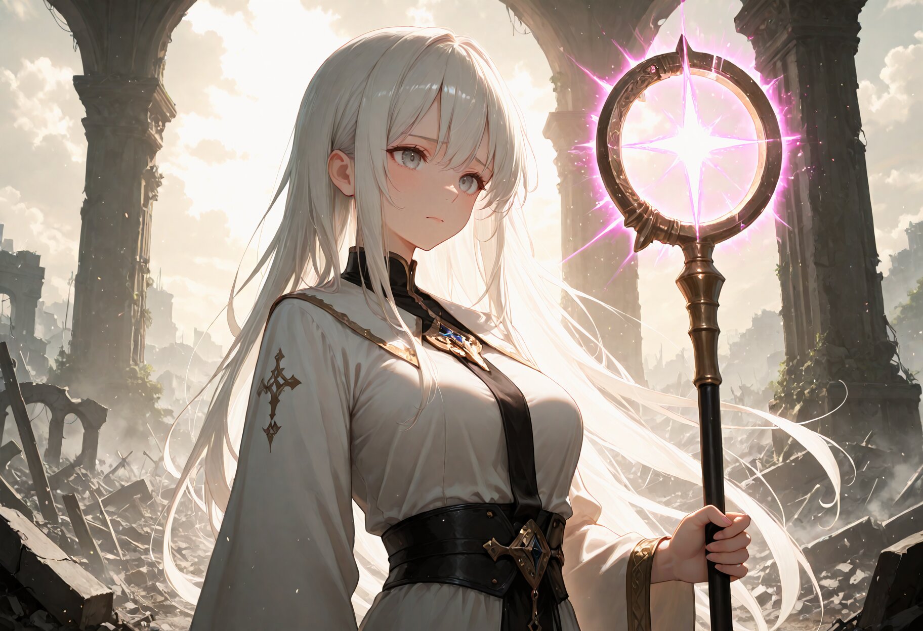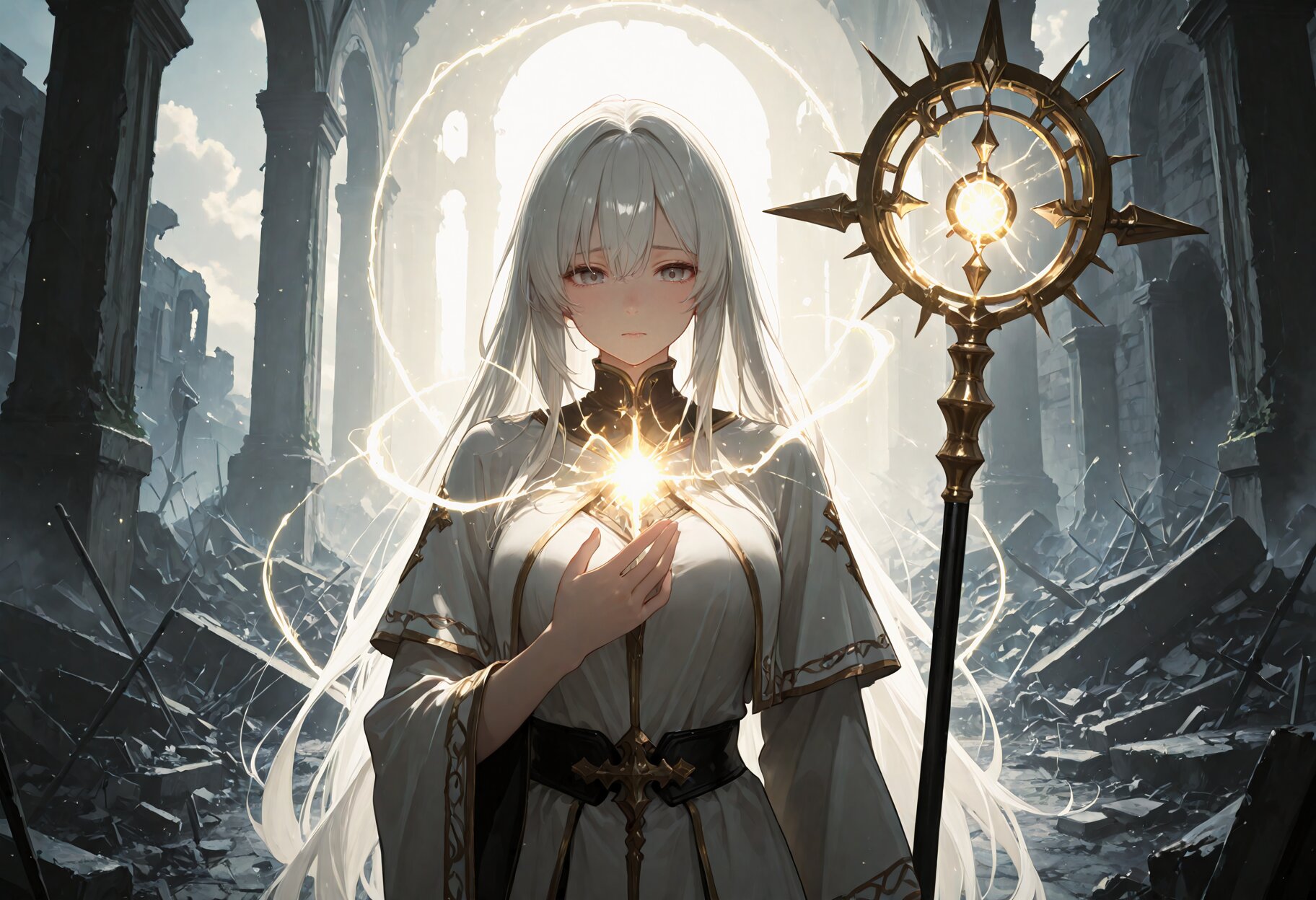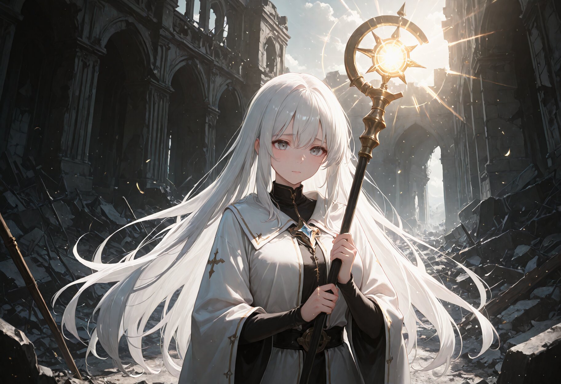 at ruins,outdoors,ancient battlefield,at day,cloudiness, 1girl,solo,saint,holding staff, white hair,grey eyes,(magical energy, emitting light, ethereal glow, cinematic lighting,:1.3),light rays,sad, upper body,, appropriate posture,appropriate configuration,ideal ratio body proportions,perfect anatomy, <lora:Fixhands_anime_bdsqlsz_V1:1>, masterpiece,best quality,newest,absurdres,highres,ultra high res,8K UHD,hyper-detailed,