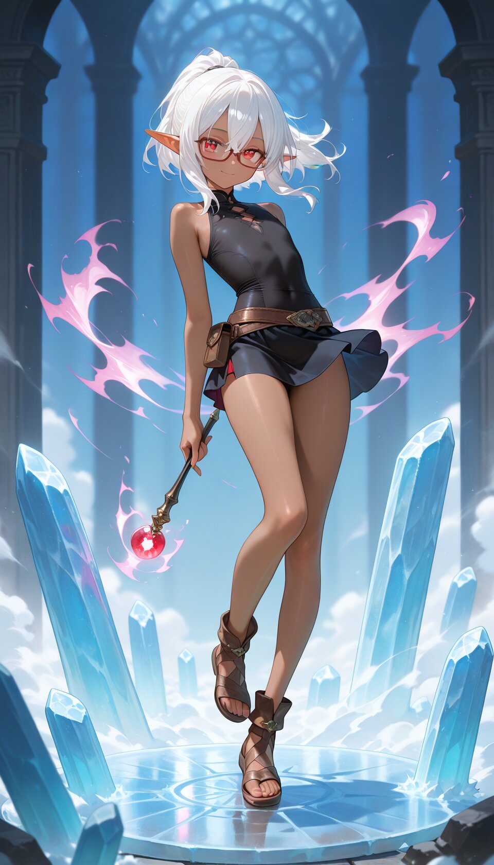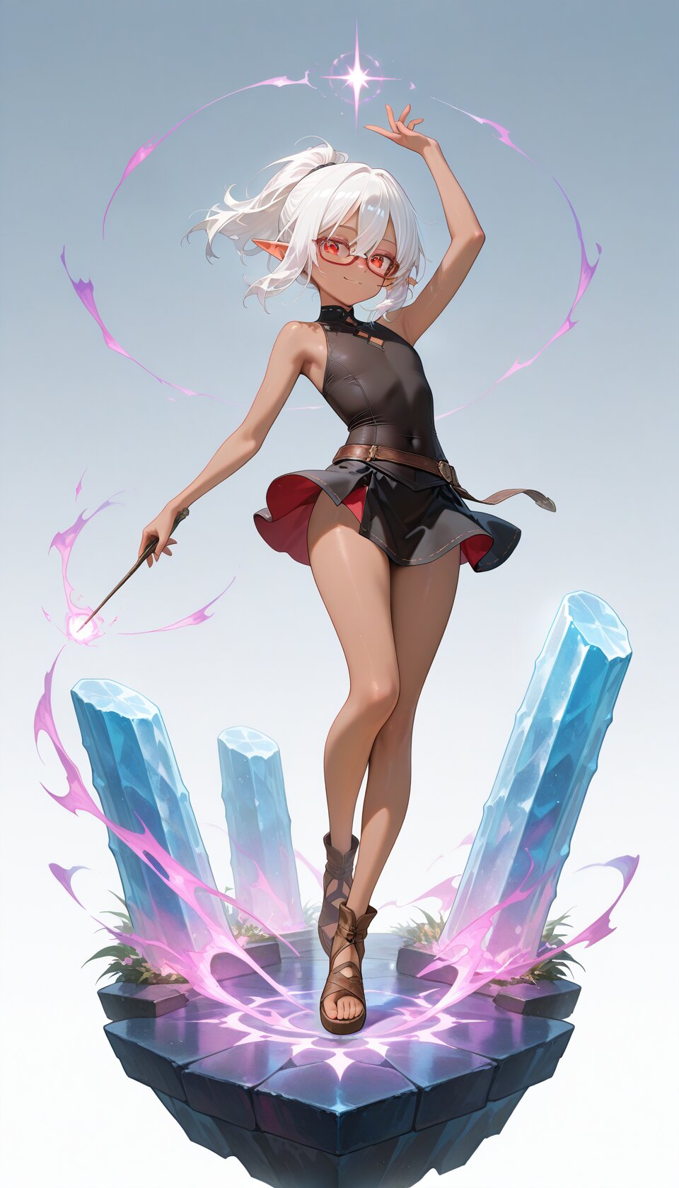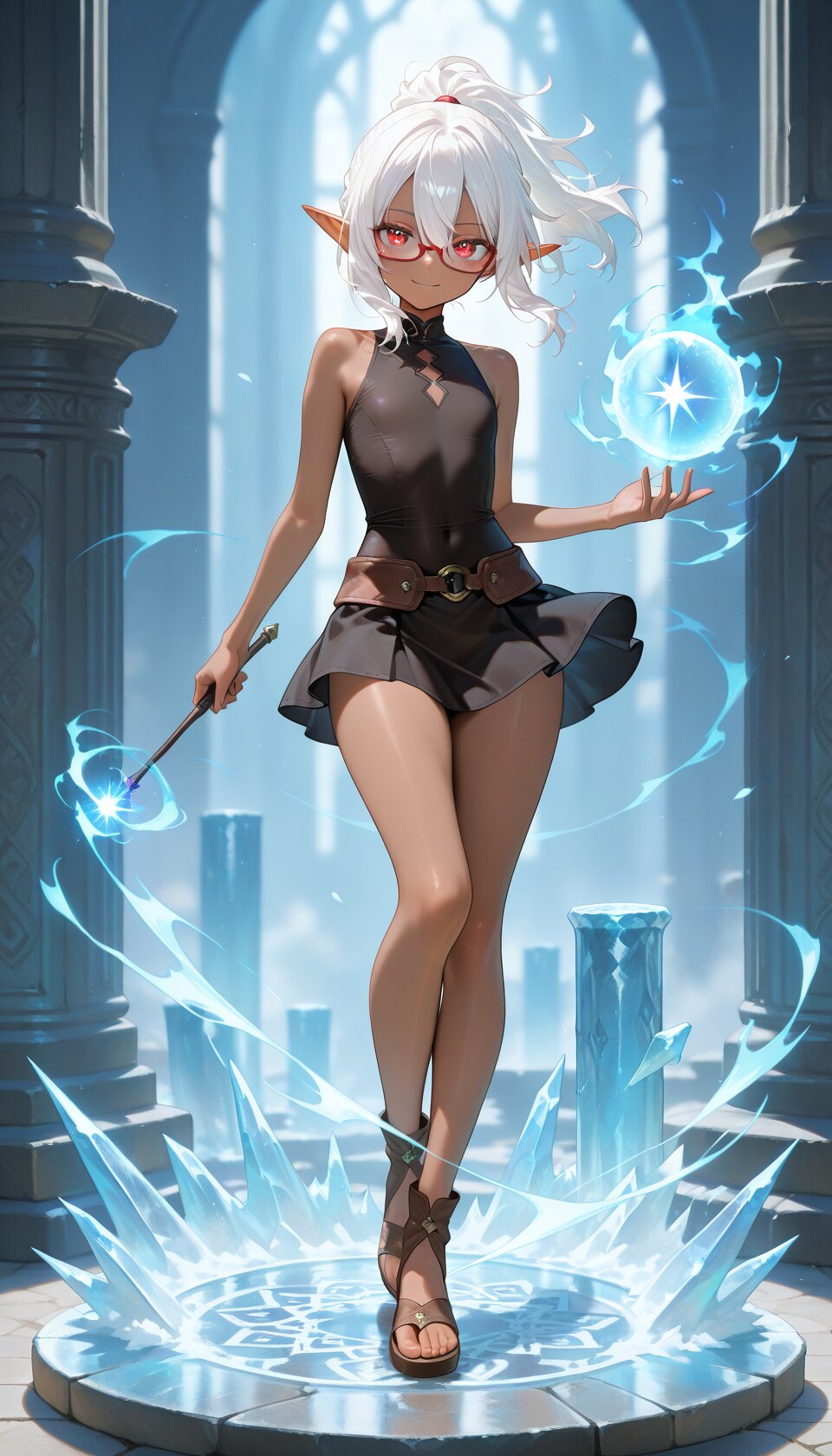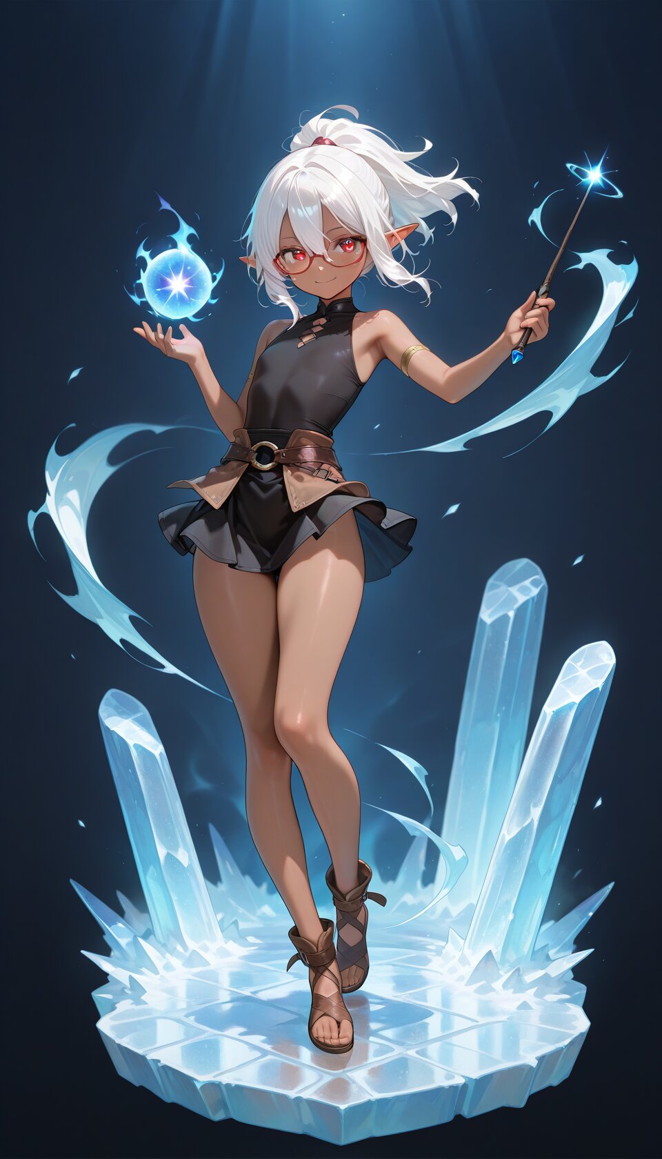 1girl, sensitive, tachi-e, faux figurine, fantasy, cryokinesis, aura, frozen pillar, female focus, (beautiful eyes, detailed eyes), looking at viewer, solo, cute, full body, wind lift, floating hair, (dark skin, red-framed eyewear:1.2), white hair, ponytail, medium hair, hair between eyes, flat chest, red eyes, elf, tight shirt, sleeveless, black mini skirt, brown sandals, holding wand, dynamic pose, magic, (evil smile:0.9), light smile, lazypos, masterpiece, best quality, amazing quality,