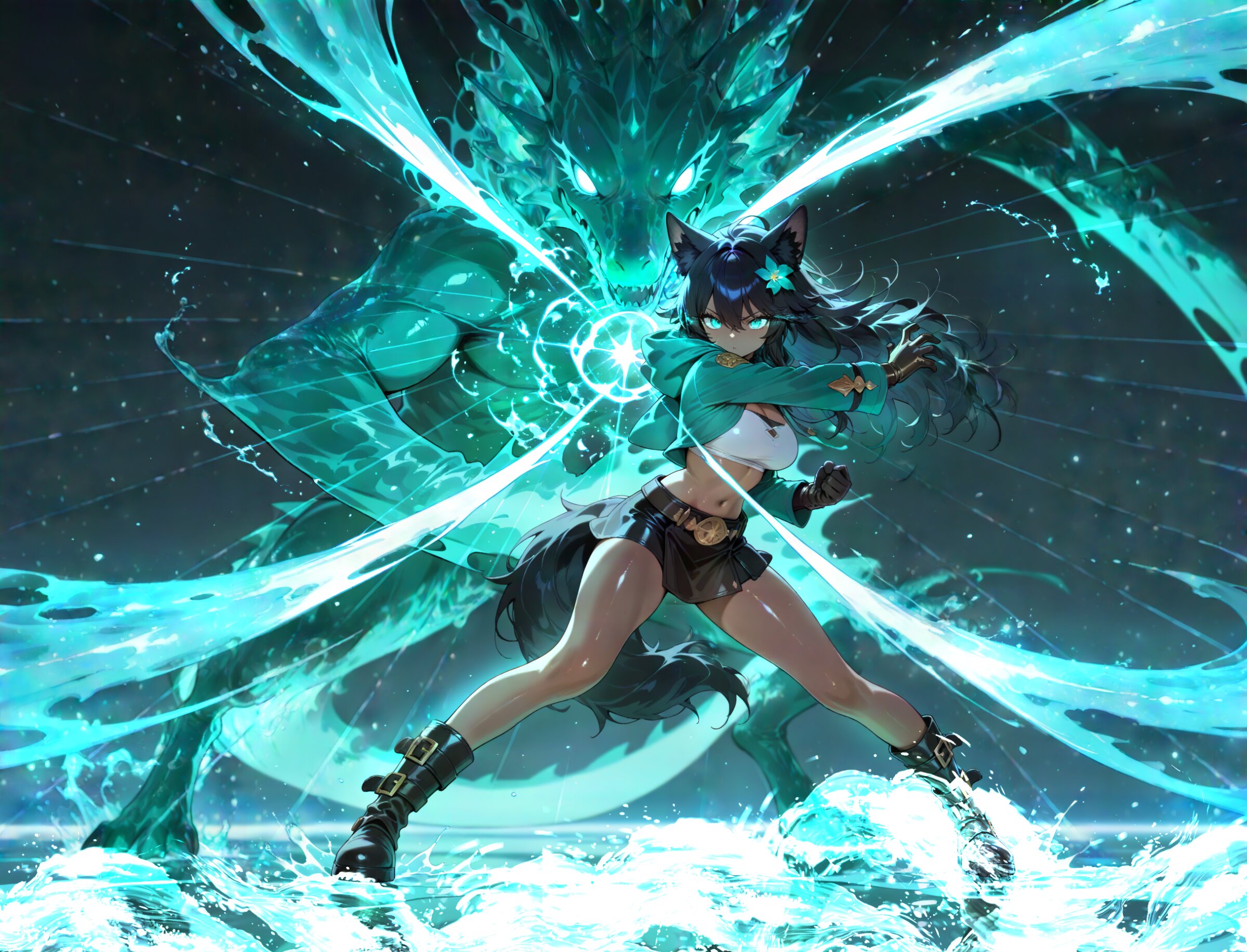 (close to viewer:1.15), knees out of frame from above from behind facing away, looking at monster 1girl, black wolf ears, dark skin, young beautiful girl, large breasts, tall, wolf tail, (aristocratic features), (Black Hair:1.2) (disheveled long hair over ears:1.3) messy hair ornament flower, (perfect turquoise eyes:1.3) long eyelashes,, wearing turquoise hood down and white tube top leather gloves, lether miniskirt, belt boots, turquoise hoodie, water magic, , kung fu attack, kung fu pose, kung fu action, (swirling energy,energy magic,energy:1.2), water magic, water flood, great clear water, reflection focus, , medieval fantasy world, battle (huge cobalt green silhouette of dragon, faceless monster:1.3), (cobalt green monster:1.2), duel, fighting, danmaku, incoming attack, super fine concept art, hard surface, 8K, unreal engine, masterpiece, best quality, amazing quality, very aesthetic, absurdres you can add scenery, (volumetric lighting), To make the background more distinctive. professional art lots of details, , overexposure, shiny-glistening, (watercolor style:0.0), (pastel color style:0.0) 4ur4_illu,shiny, glowing, glowing particles, glowing light particles, light particles, , <lora:noline (1):-0.5> <lora:sdxl2-flat2-512b:0.15> <lora:facelightup_xl_v10:0.5> <lora:V2_yakumo_alchemy:0.5> <lora:Aura_illu:0.1>