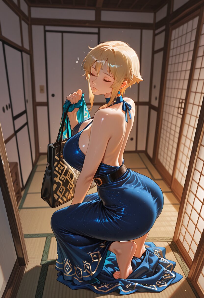(1girl),(Expressiveh),masterpiece, best quality, amazing quality, very aesthetic, high resolution, ultra-detailed, absurdres, newest, scenery,model-like proportions, radiant posture, extra large breasts, cobalt blue and blonde, pixie cut natural hair, middle par,blue organza maxi dress with slit, buckle straps, cutouts, with tote bag, low back,one knee up, high angle, fingers through hair, on tiptoes, close-up face, holding fabric, closed mouth, closed eyes, sleepy eyes, upward glance, tiny mouth corner lift, shimmering eyes, gentle warmth,,tatami room, tatami mats, clear sky, pre-dawn darkness, cinematic haze, paper sliding doors, full-length mirror,dawn mist, soft glow, glowing outline, eye-level view, three-quarter shot, glossed skin in shallow focus,,,BREAK, depth of field, volumetric lighting