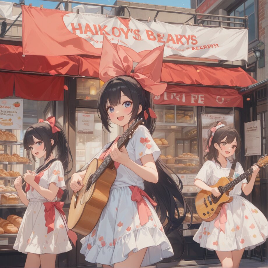 masterpiece, best quality, Girls' Front, large audience, in front of the entrance to the newly opened bakery, delicious breads, opening event, multiple Banner flags, 3girl, kawaii, smiling, idols, girl's band, Advertises a bakery, singing a song, dancing, playing a guiters, full body, black hair, hair, ponytail, long hair, white scrunchie, Close-up of girls,,,((8k,Ultra HD,Best quality:1.2)), (two hands per person), ((Fix hands,fix fingers)), ((Anti-disabled hands)), ((Detailed hands,Ultra Detailed,Realistic hands,Natural hands)), (Very nice hands)