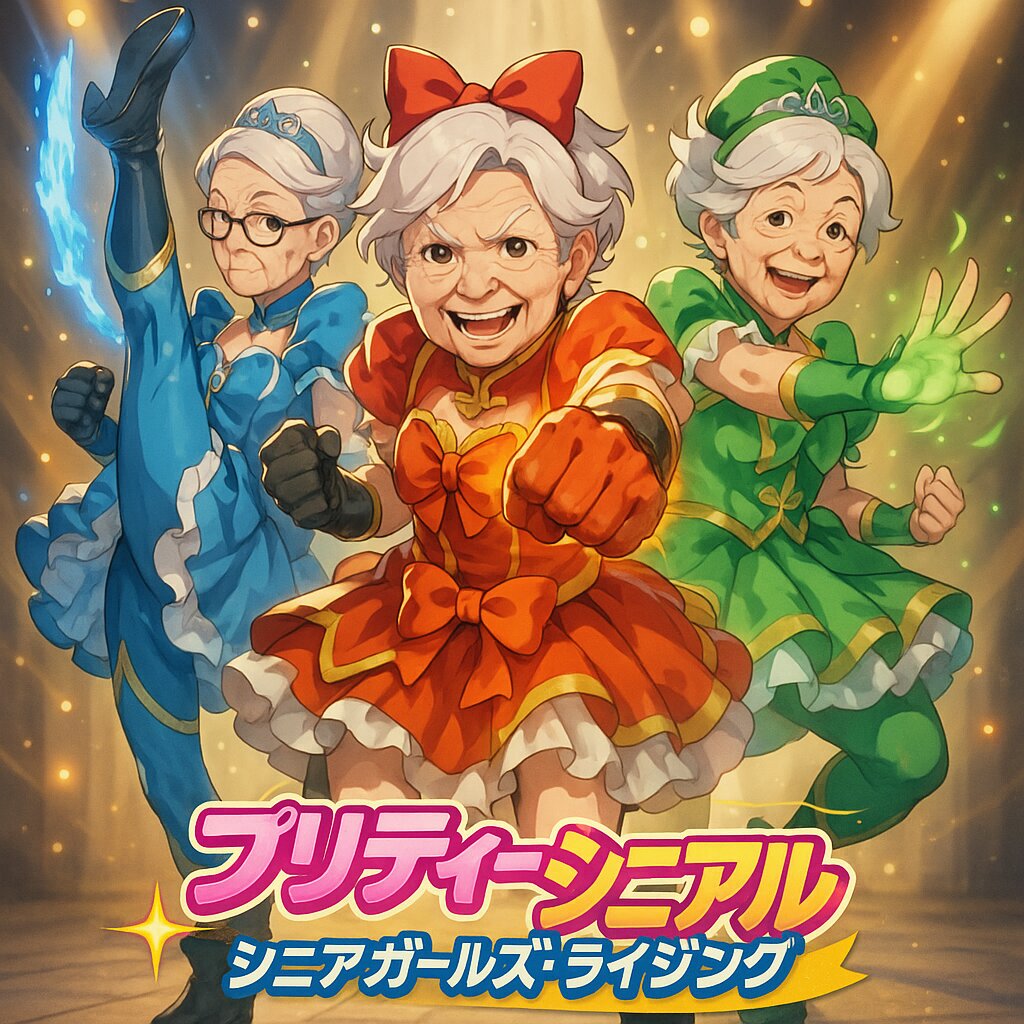 アニメ風イラスト。映画ポスター風の集合ビジュアル。舞台上で3人の高齢女性(米寿のおばあちゃん)が魔法少女風の衣装で並び立ち、迫力ある決めポーズをとっている。衣装は赤・青・緑で色違い。赤の女性は拳に炎のオーラを纏い、青の女性は蹴り足に氷のオーラを纏い、緑の女性は掌から風の衝撃波を放つ。背景はスポットライトと光の粒子が舞うステージ。華やかで迫力のある集合ポスター風。上部に日本語タイトル「プリティーシニアル」、下部にサブタイトル「シニアガールズライジング」を配置。