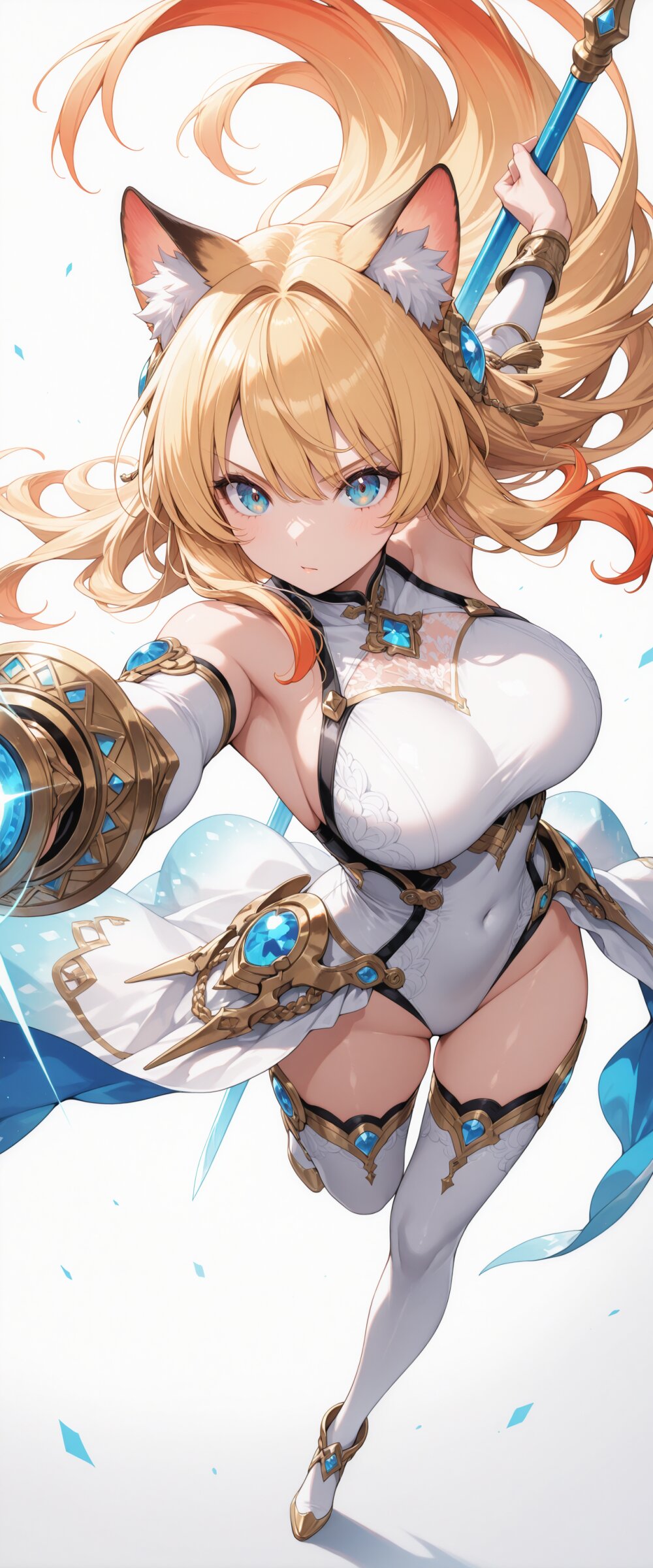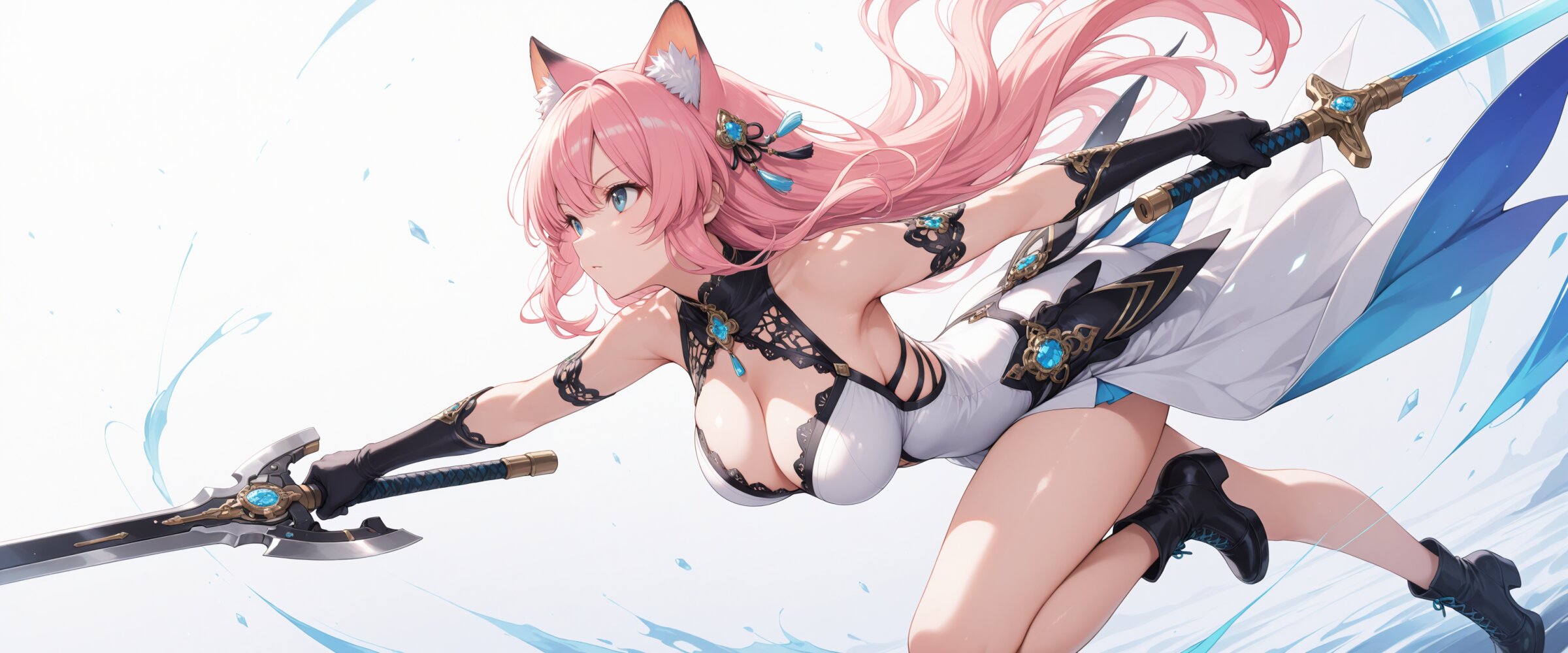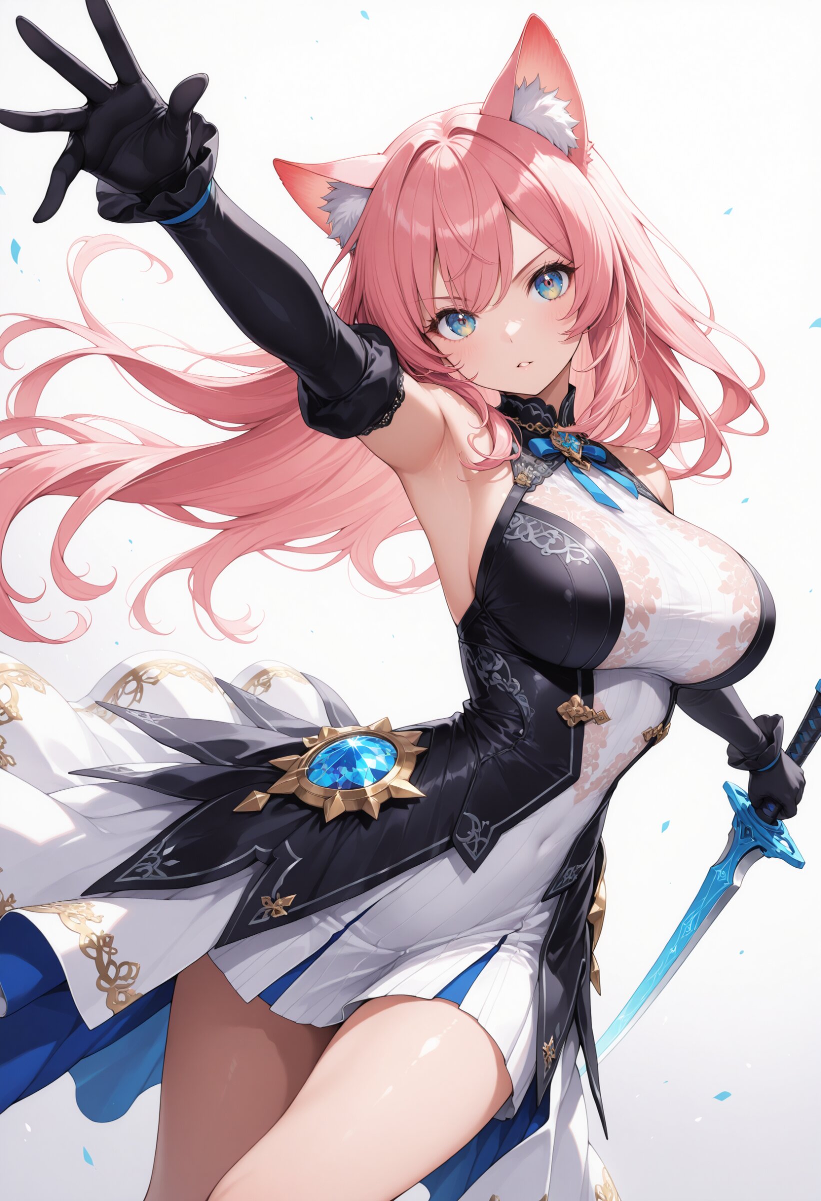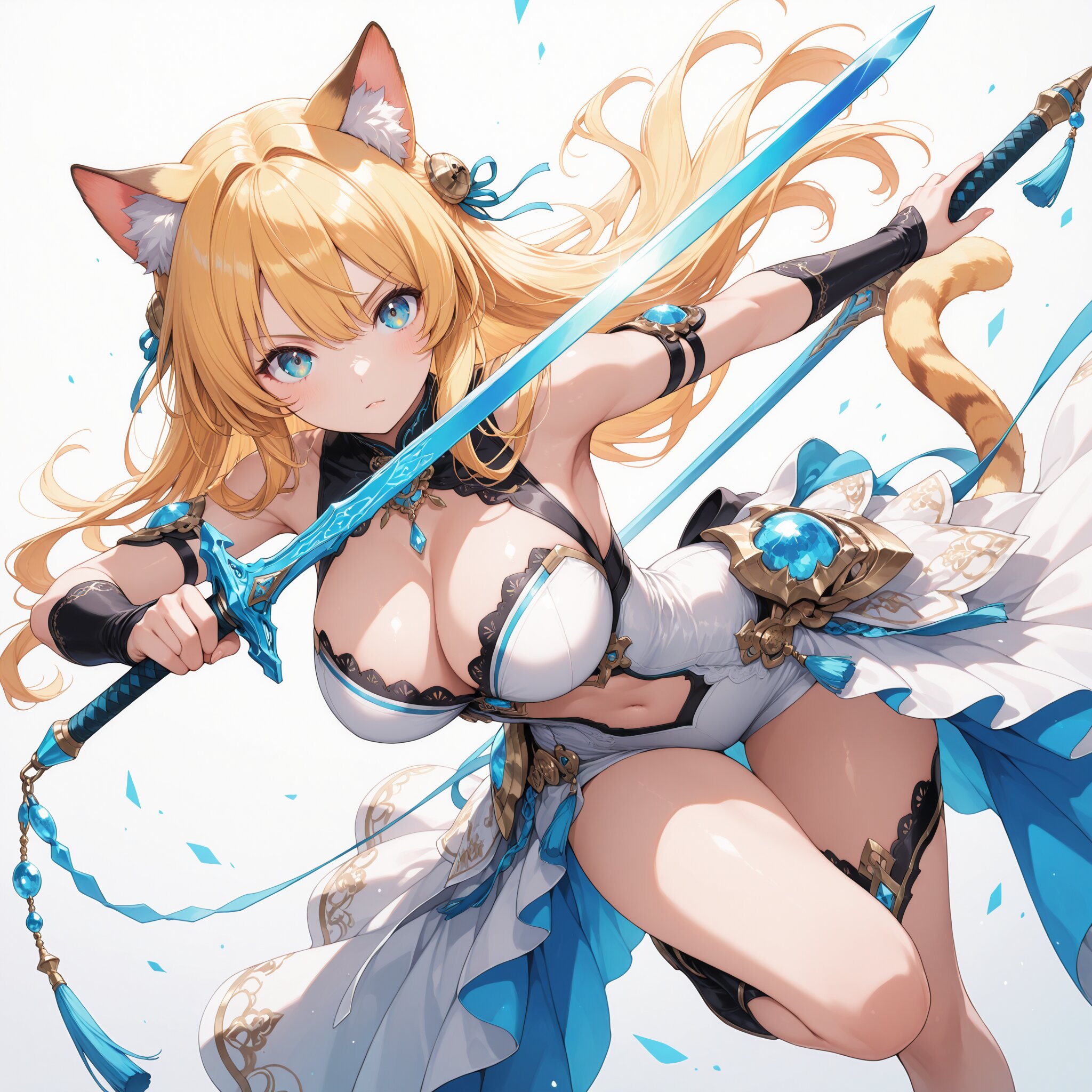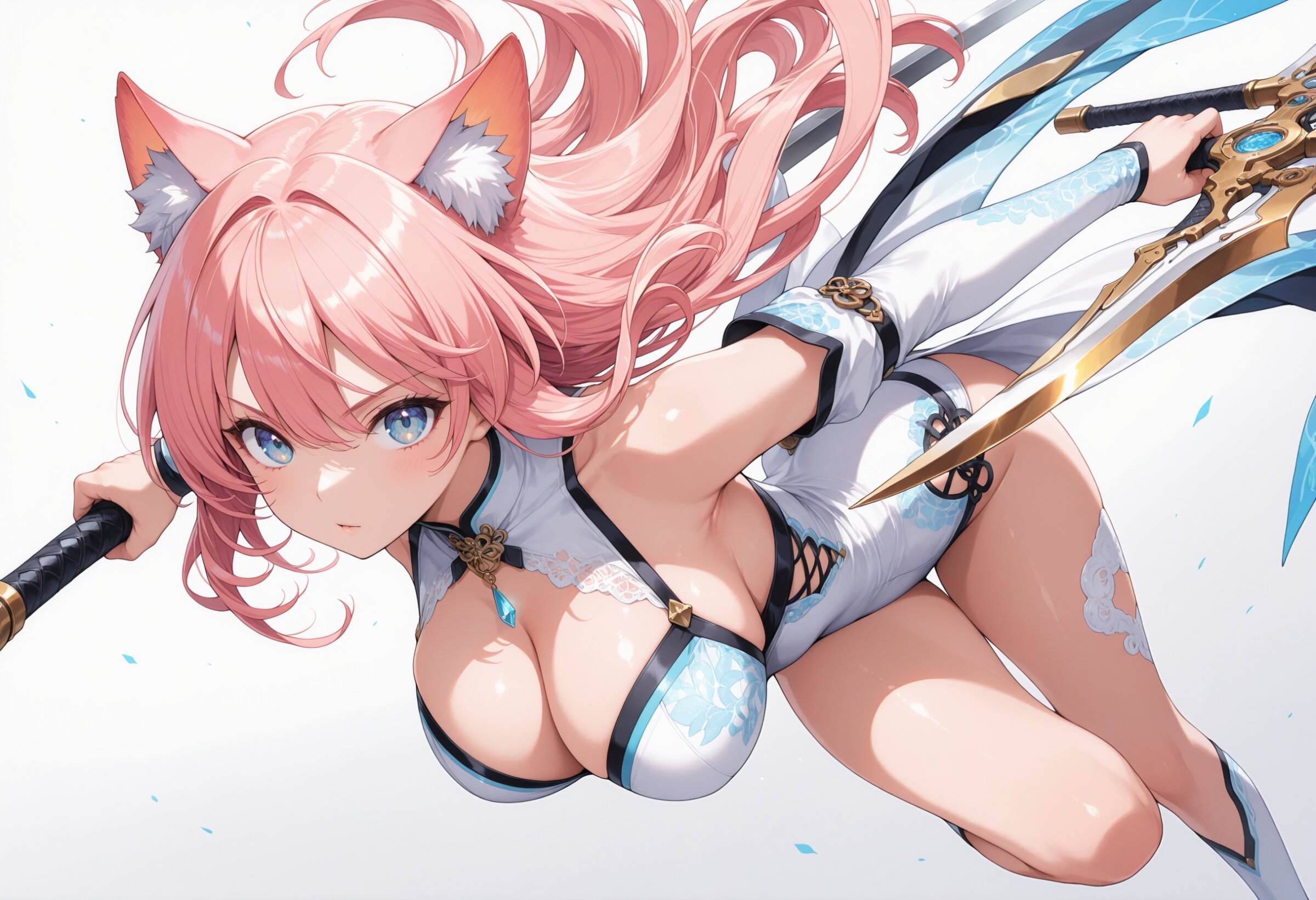masterpiece, best quality, ultra-detailed, intricate details, highly detailed face, 8k illustration, shine colorful, natural cat ears, large breasts, weapon, dynamic pose, dynamic angle, simple background,