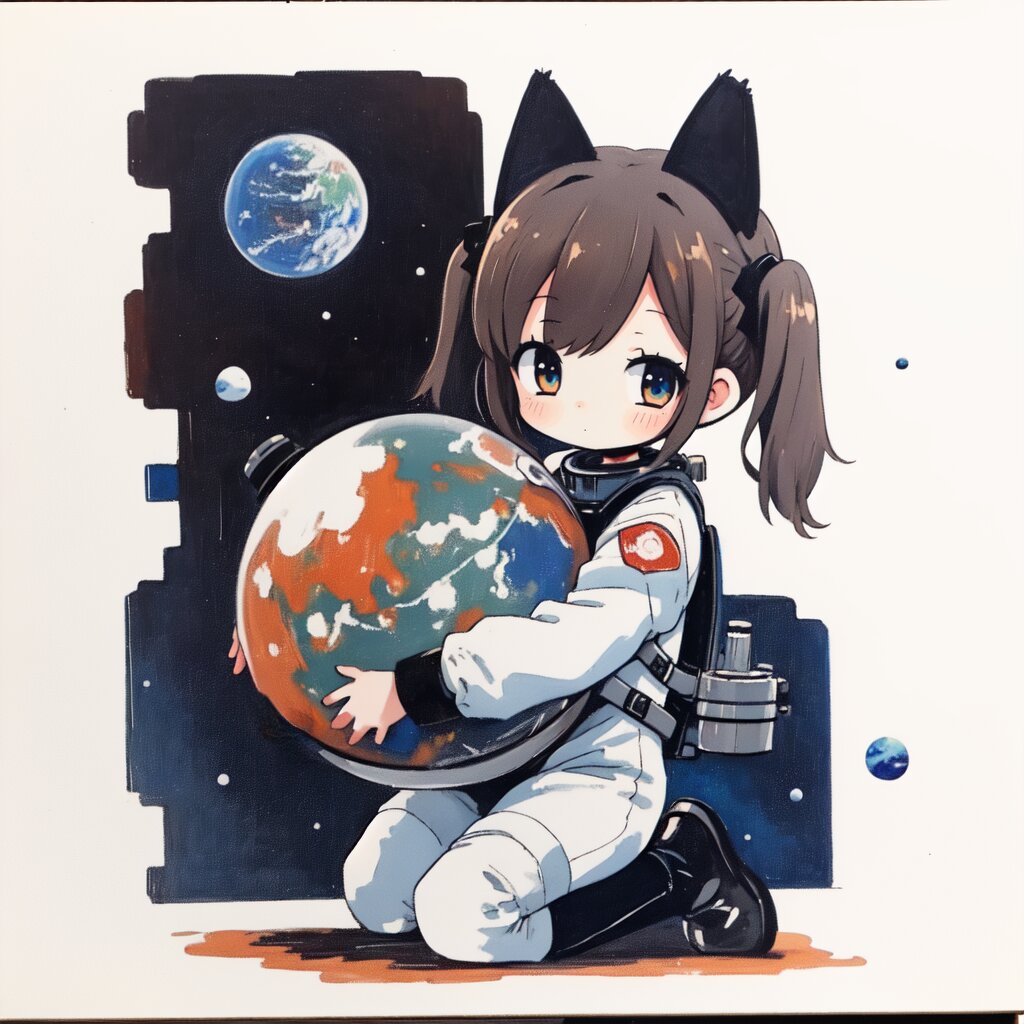 best quality,(oil painting \(medium\):1.2),traditional media, solo,1girl,(chibi:1.2),cat ears,twintails,spacesuit,(zero gravity:1.2),hug earth \(planet\), space,nebula, <lora:fineline_v1:1.0>