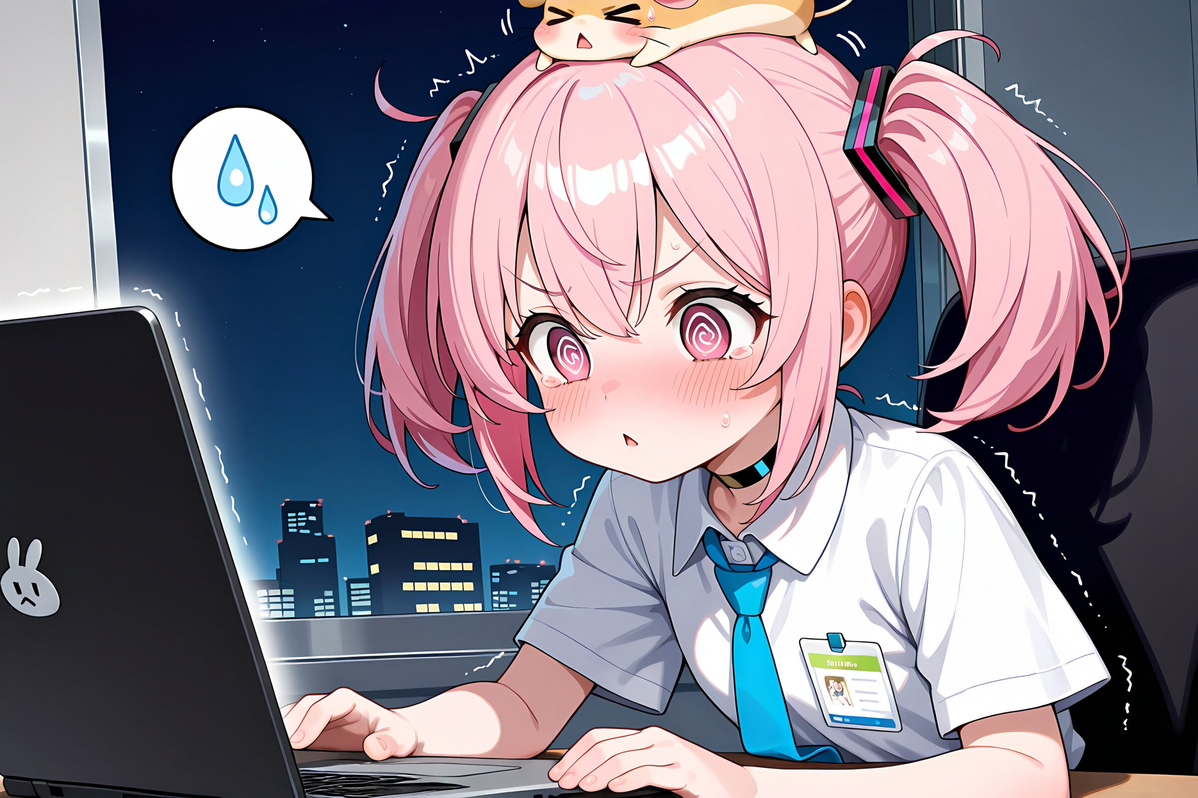 1 little girl, solo, diagonal angle, upper body, masterpiece, best quality, amazing quality, very aesthetic, pink hair, twintails, pink eyes, @_@, chestnut mouth, angry, troubled, confused, tearful, blush, trembling, sweat, flying sweatdrop, spoken sweatdrop, choker, white shirt, short sleeves, blue tie, closed neck, sitting, laptop, hamsters on head, > <, office, night,