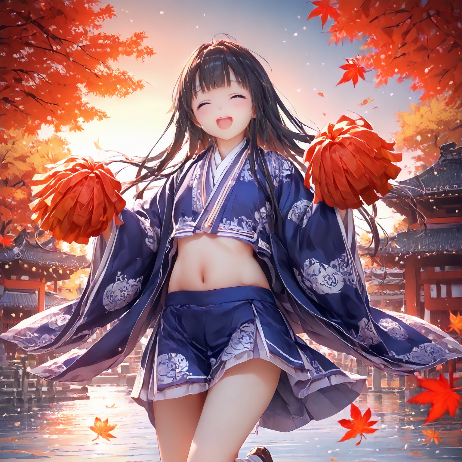 score_9, score_8_up, score_7_up, score_6_up, score_5_up, score_4_up, rating_safe, best quality, ultra hi res, dynamic angle, 1 beautiful girl, detailed face, detailed mouth, Glossy lips, natural make up, black long hair, blunt bangs, small breast, (belly button), (slender body), (Separate kimonos), (JyuuniHitoe), 1girl, japanese clothes, layered clothes, layered kimono, kimono, hair ornament, (Pom poms:1.5), closed eyes, (happy laughing), blush, open mouth, hands up, jumping, (outdoor), Autumn scenery, fallen leaves, autumn leaves, orange sky, Beautiful traditional Japanese temples, Five-story pagoda, Kinkakuji Temple, lake, beautiful lighting, perfect lighting,