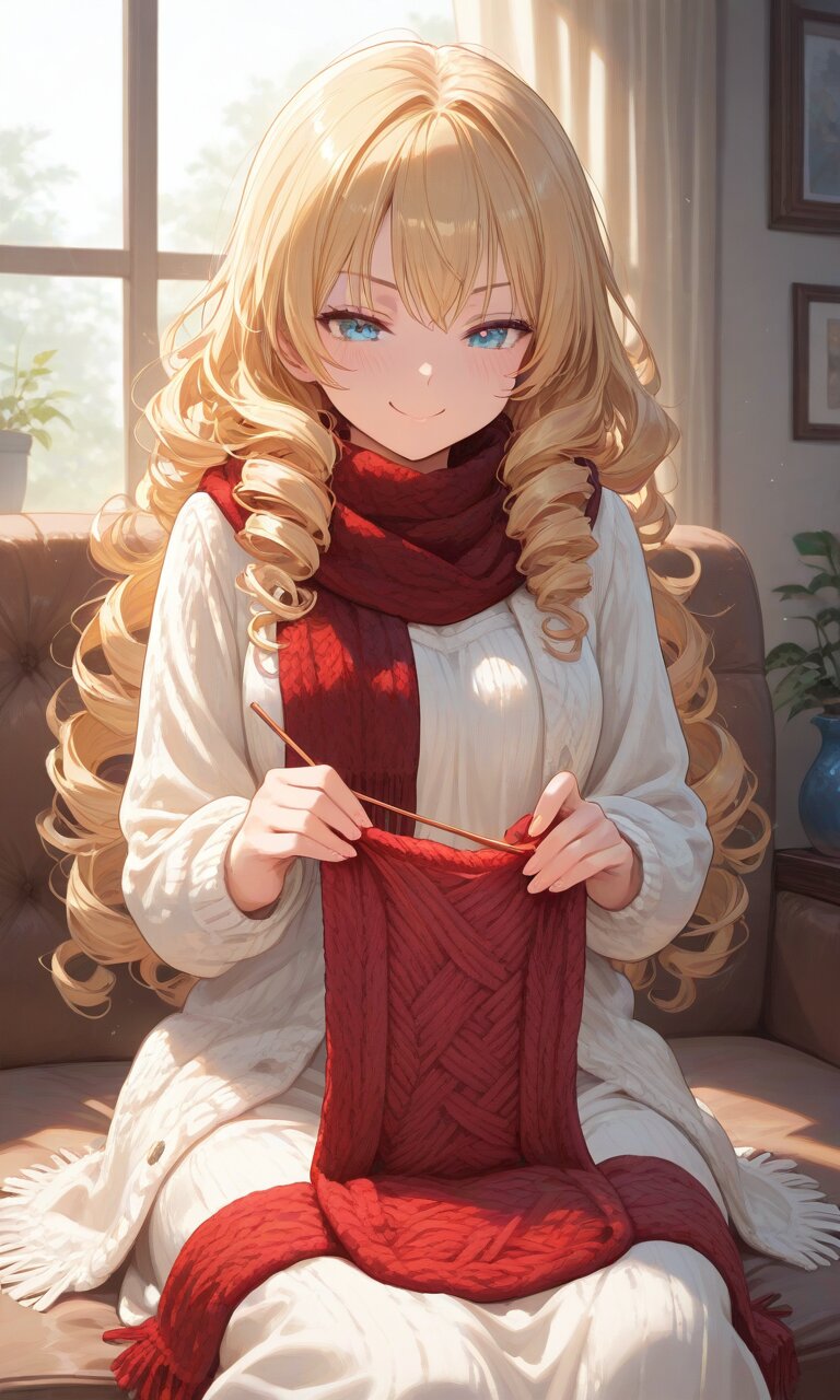 (best quality),(masterpiece),(ultra detailed),1 lady, long hair, blonde hair, blue eyes, spiral curls, smugness, ((knitting)), sitting, scurf, smile