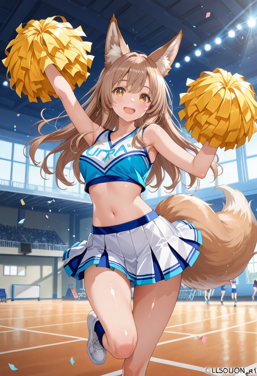 (masterpiece,high resolusion,illustration,ultra detailed 8k art,extremely detailed CG,official art,clothes reflecting light,detailed shiny skin,detailed background:1.3), ((highly detailed beautiful face and eyes),anime style, fox ears girl, light brown hair, long hair, double eyelids, long eyelashes, fluffy tail, cheerful cheerleader, friday energy, pom poms, jumping pose, bright smile, school gym background, dynamic movement, vibrant lighting, playful atmosphere, fantasy realism, cinematic composition, ultra-detailed, masterpiece