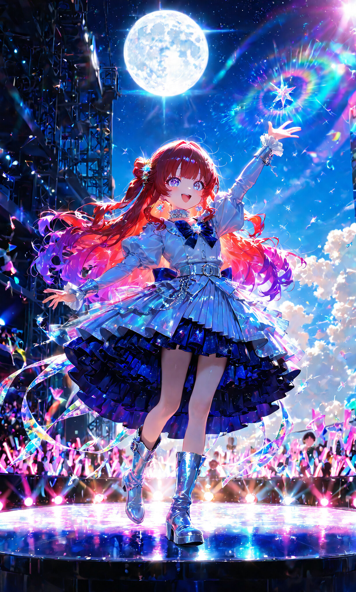 1girl, masterpiece, best quality, ultra-detailed, anime style, full body, idol, outdoor stage, blue sky, white clouds, raising hand, extending arm, step forward, decisive pose, smiling, open mouth, burgundy hair, long hair, glamorous costume, pearl white silk satin, rainbow glitter fabric, gold and silver star sequins, chiffon frills, holographic rhinestones, crystal bead choker, pleated skirt, checkered pattern, layered tulle, pink gradient, blue gradient, lavender gradient, ribbons, metallic silver satin, embroidered hem, stars, hearts, Swarovski crystals, golden star hair ornaments, moon hair ornaments, opal gems, teardrop crystal earrings, silver bracelet, musical note charms, white leather belt, glowing acrylic ribbon buckle, silver glitter boots, star crystals
