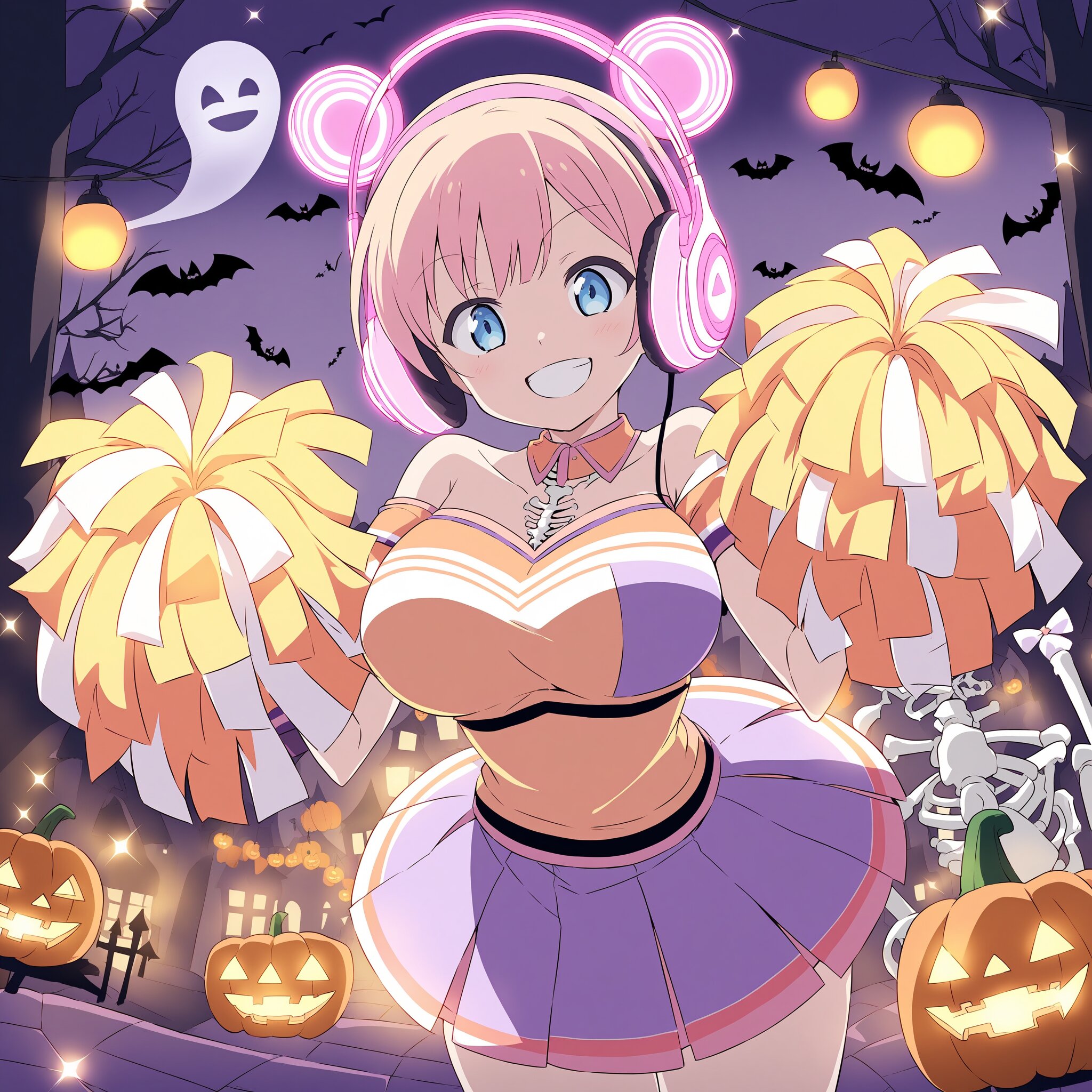 A highly detailed (anime illustration:1.5), (pastel-neon palette:1.5), full-body artwork of (Zena:1.8), a top idol and (cheerleader:1.6), performing in the center of a festive (Halloween town:1.7). Zena has a (short pastel-orange bob haircut:1.5) and wears her signature (pastel-pink headphones with small monkey ears:1.6). She is dressed in a bright (idol-style cheerleader uniform:1.6) — (off-shoulder top:1.4), (short pleated skirt:1.5), accented with pastel-orange and pastel-pink ribbons. The outfit includes sparkling lace and sheer fabric that shimmer under the moonlight. She holds (pumpkin-themed pom-poms:1.5) and strikes a dynamic (cheer pose:1.6), radiating (idol energy:1.6) and (joyful encouragement:1.6). Her expression is a huge (big smile:1.7), full of charm and energy. The background shows a whimsical (Halloween town square:1.6), with crooked candy-colored houses decorated with (jack-o’-lantern lights:1.6), (floating ghost lanterns:1.5), and (bats carrying tiny ribbons:1.4). Residents of the town — (friendly monsters:1.5), (skeleton musicians:1.5), (witch children:1.4), and (pumpkin-headed townsfolk:1.5) — gather to cheer, clap, and wave glowing signs with Zena’s name. The environment is (pop and playful:1.6), but with a subtle (spooky atmosphere:1.4). Cinematic direction from a (pro photographer’s viewpoint:1.6): slightly low-angle shot to make Zena look radiant and powerful on stage. (Spotlight beams:1.4) shine on her, while (soft moonlight:1.3) bathes the town, mixing cheerfulness with gentle eeriness. Composition captures both Zena and the festive Halloween crowd, creating a vibrant and magical idol performance. Ultra high resolution, masterpiece, no text, no watermark.