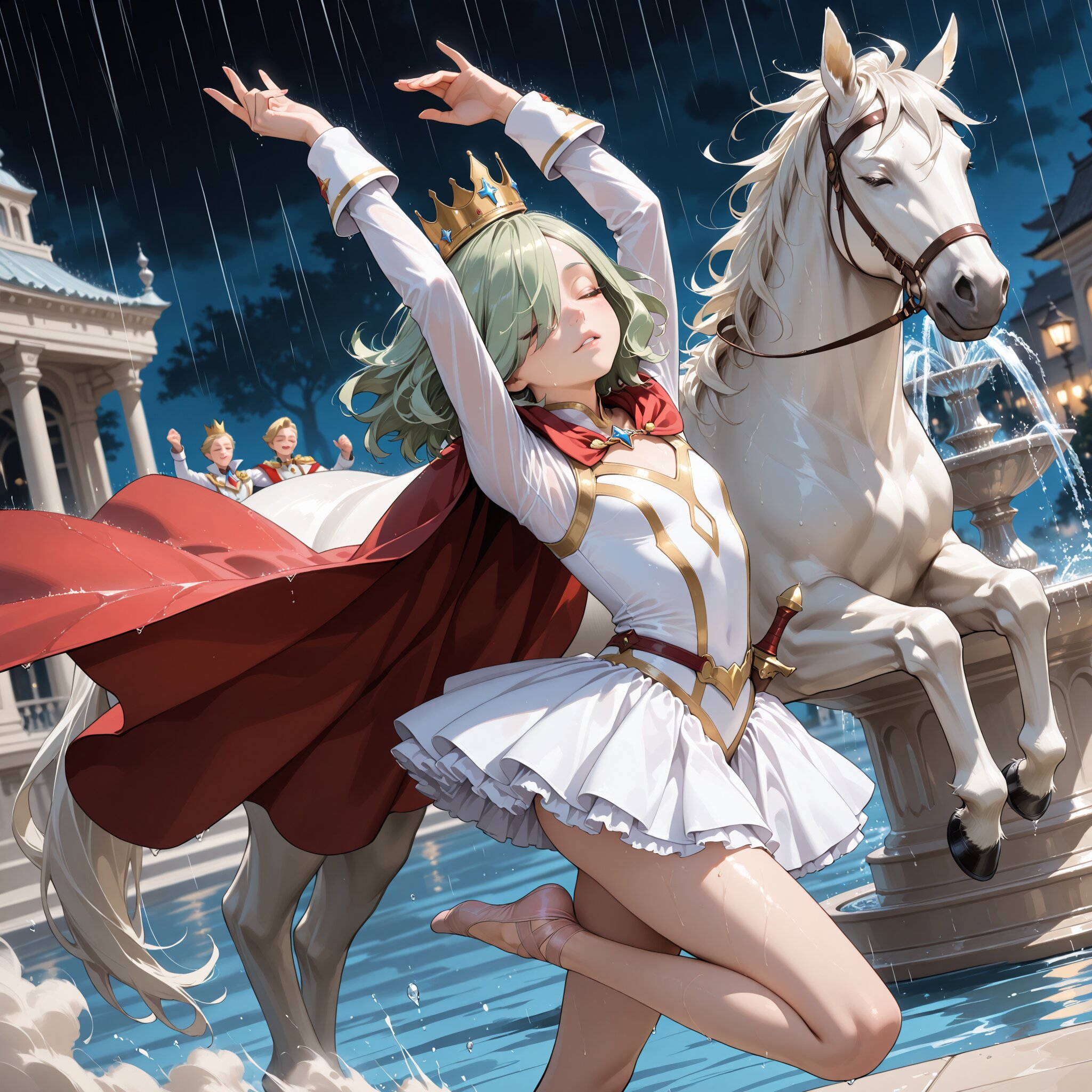 chibi, hair over one eye, flat chest, green hair, medium hair, [wavy hair],delicate face,detailed face,detailed skin,masterpiece,best quality,insanely detailed,beautiful,8k,photorealistic,dynamic lighting,(an extremely delicate and beautiful),(dancing:1.2),dancing in the rain,dynamic angle,(closed eyes:1.2),floating hair,barefoot,toes,water,depth of field,rainy,outdoors,fountain,very detailed background,(water color:1.5),(arms raised in the air:1.3),stand on one leg,standing split,outside,at night,with rain,hazy atmosphere,art academia,dust effect,darkness,bloom,cold lighting,in focus with blurred background,romantic academia,(ballet dancing:1.5),(red cape:1.2),(dagger on waist:1.3),(with a white horse:1.4),(crown:1.2),prince charming,classic academia,fairy academia,mini skirt,rococo architecture,hyperrealistic photo,long sleeves,(White prince costume:1.6)