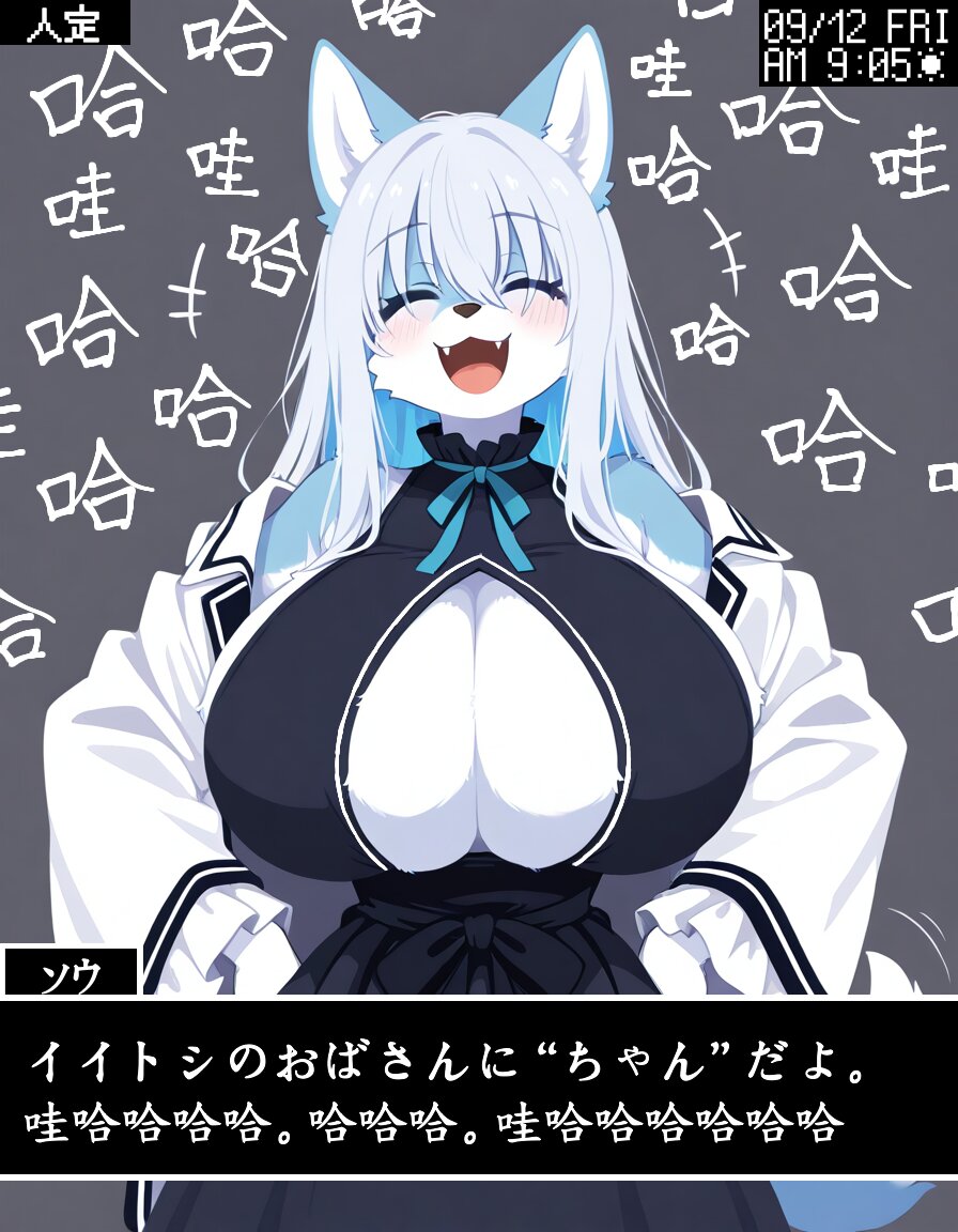 1girl, wolf girl, furry female, snout:1.3, light-blue fur, wolf ears, ears up, wolf tail, body fur, gigantic breasts, sagging breasts, narrow waist, silver hair, hime-cut, long hair, colored inner hair, hair between eyes, hair over eyes, closed eyes, long bangs, tareme, high collar, frilled collar, blue neck ribbon with loose ends, bare shoulders, revealing clothes, undersized clothes, white jacket on shoulders, black dress, frill-trimmed dress, sleeveless dress, underboob, clothing cutout, triangular underboob cutout, cleavage cutout, large waist bow, detached sleeves, frilled sleeves, wide sleeves, smile, fangs, laughing, big mouth, wide open mouth, hands on own hips, wagging tail, gray background, hair shade, low contrast, digital art:1.1, anime coloring, kawaii, softy, 2D, cute, furry, two tone fur, furry body, perfect body, detailed face, high quality, cute clothes, animal tail, animal ears, solo, masterpiece, correct_anatomy, gddw, pretty and cute, comical, simple, anime, flat color, no lineart, Bright colors, Contour line, pale painting