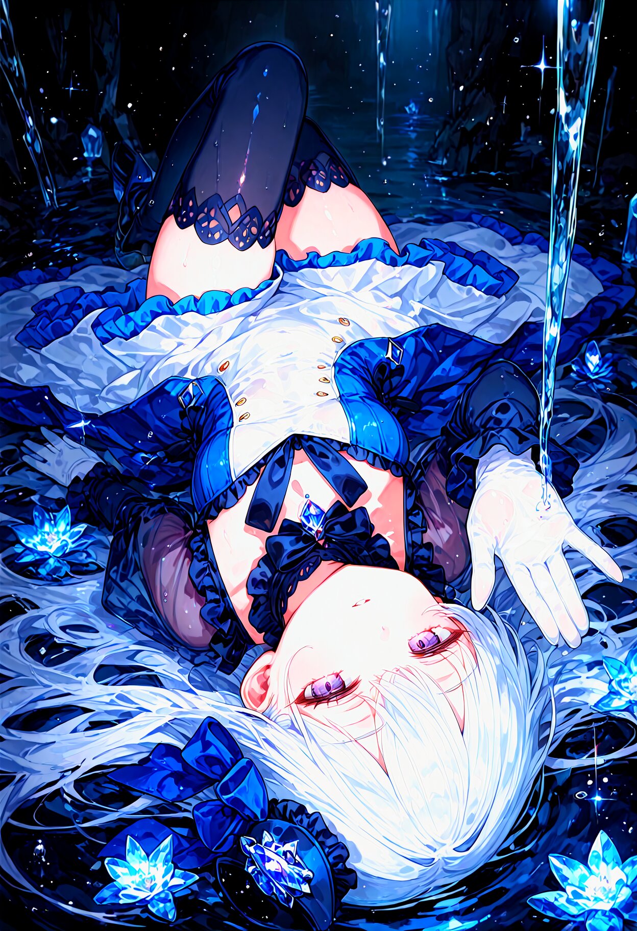 beautiful detailed background, best quality, (acrylic_paint_\(medium\):1.5) (latex:1.1) , parted lips,(Expressionless:0.9), big eyes,(half-closed eyes:1.1), tareme, pale purple eyes, (silver hair:1.1), (dark blue hair colored inner hair:0.8), long hair, eyebrows visible through hair, see-through veil, mini hat, blue strapping ribbon and bow, frills, thighhighs, white gloves,wet gloves, sparkle, crystal,crystal flower, cinematic, dynamic light, upside down, perspective, white and (darkblue:1.2) two-tone dress, (see-through,:1.5) looking at viewer, waving,stretch your legs, (water:1.1), water drop,wet, liquid, five fingers, <lora:sdxl2-flat2-512b:-1.5> <lora:noline-16oa:0.7> <lora:sdxl-shadow_01:-0.7> <lora:LECO_BadHands:-1.1>