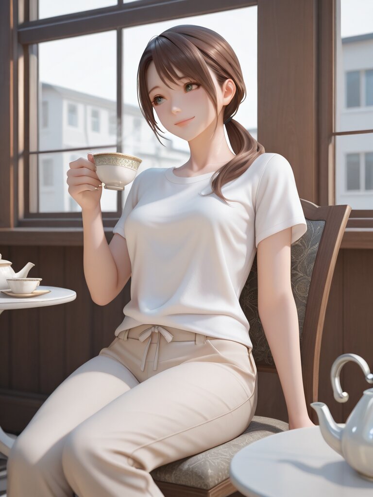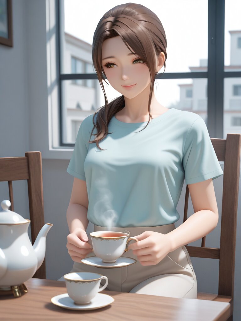 Masterpiece, Best Quality, High Quality, Detailed, Absurdres, General, 3D, Realistic, 1Girl, Small_Breasts, Mature_Female, Aged_Up, T-Shirt, Long_Pants, Brown Eyes, Long_Hair, Ponytail, Brown_Hair, Light_Smile, Looking_Away, Sitting, Tea_Party, Teapot, Cup, Steam, Chair, Table, Holding_Cup, Indoors, Public_Housing, Noon, Window, Apartment, BREAK, Depth of Field, Volumetric Lighting,